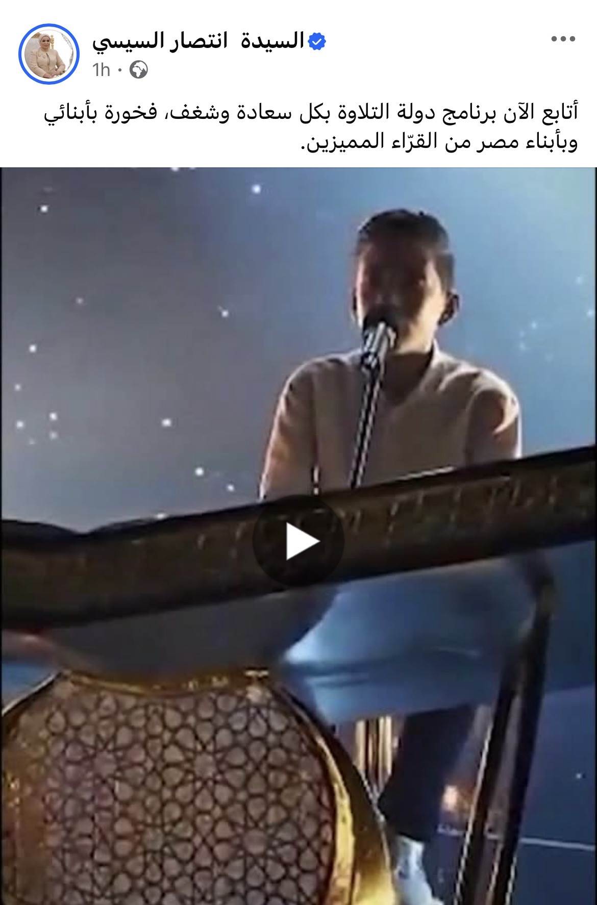 قالت السيدة انتصار السيسى، قرينة رئيس الجمهورية، إنها تتابع الآن برنامج دولة التلاوة بكل سعادة وشغف، مضيفة: "فخورة بأبنائي وبأبناء مصر من القرّاء المميزين" - جاء ذلك عبر الصفحة الرسمية للسيدة انتصار السيسي بموقع التواصل الاجتماعى "فيس بوك".
