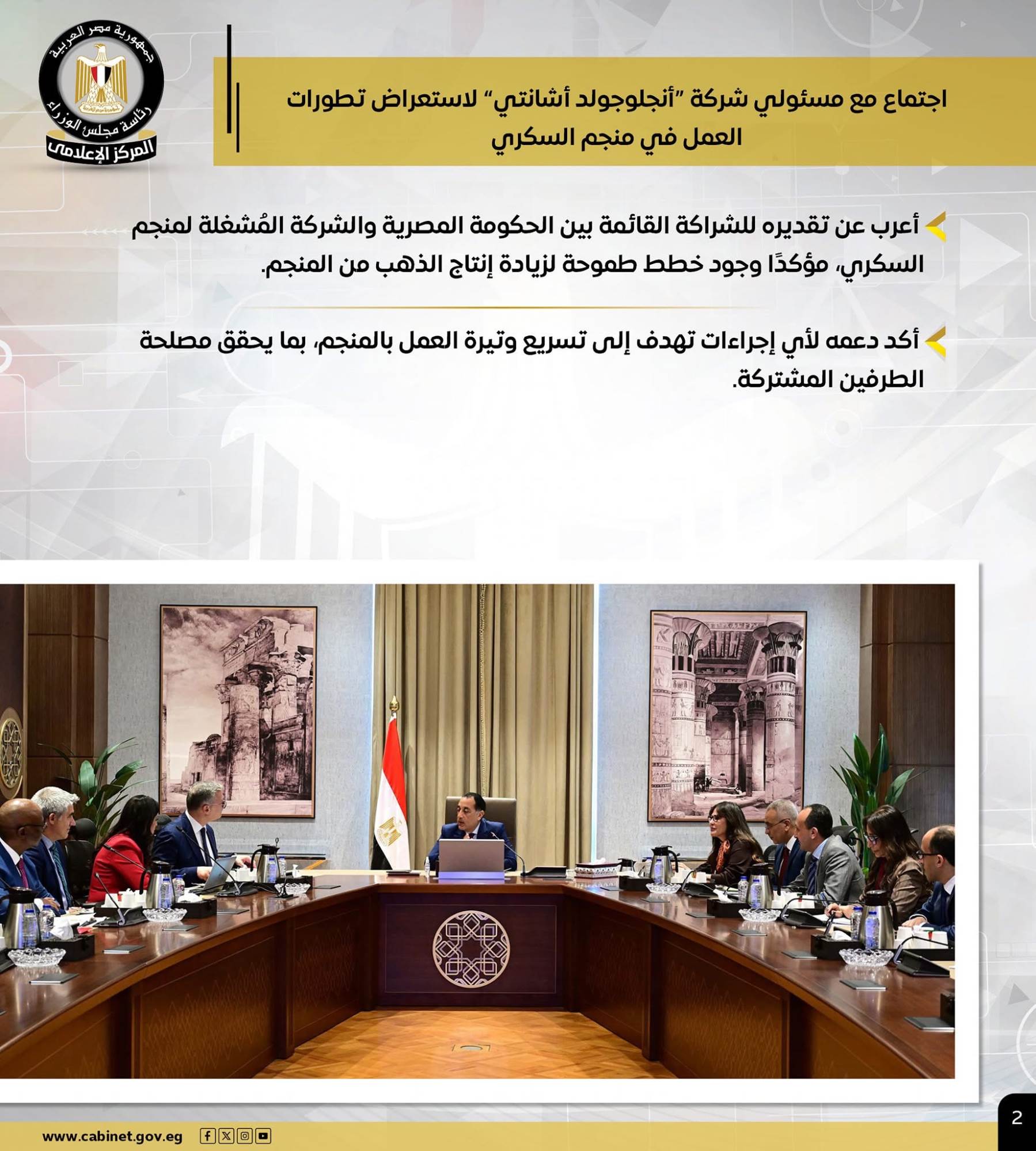 كما عقد سيادته اجتماعًا مع مسئولي شركة "أنجلوجولد أشانتي" لاستعراض تطورات العمل في منجم السكري، مؤكدًا دعمه لأي إجراءات تهدف إلى تسريع وتيرة العمل بالمنجم بما يحقق مصلحة الطرفين المشتركة، معربًا عن تقديره للشراكة القائمة بين الحكومة والشركة المشغلة لمنجم السكري، مؤكدًا وجود خطط طموحة لزيادة إنتاج الذهب من المنجم.