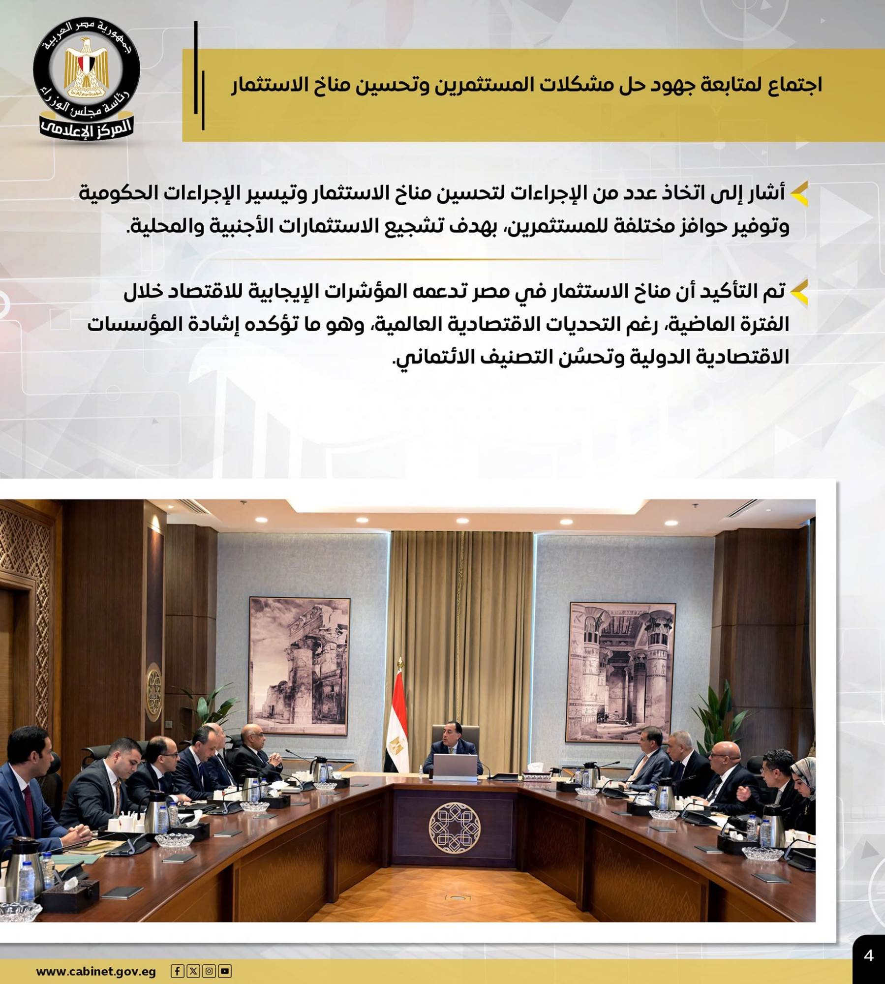 كما عقد رئيس الوزراء اجتماعًا لمتابعة جهود حل مشكلات المستثمرين وتحسين مناخ الاستثمار، مشيرًا إلى اتخاذ عدد من الإجراءات لتحسين مناخ الاستثمار وتيسير الإجراءات الحكومية وتوفير حوافز مختلفة للمستثمرين، بهدف تشجيع الاستثمارات الأجنبية والمحلية.