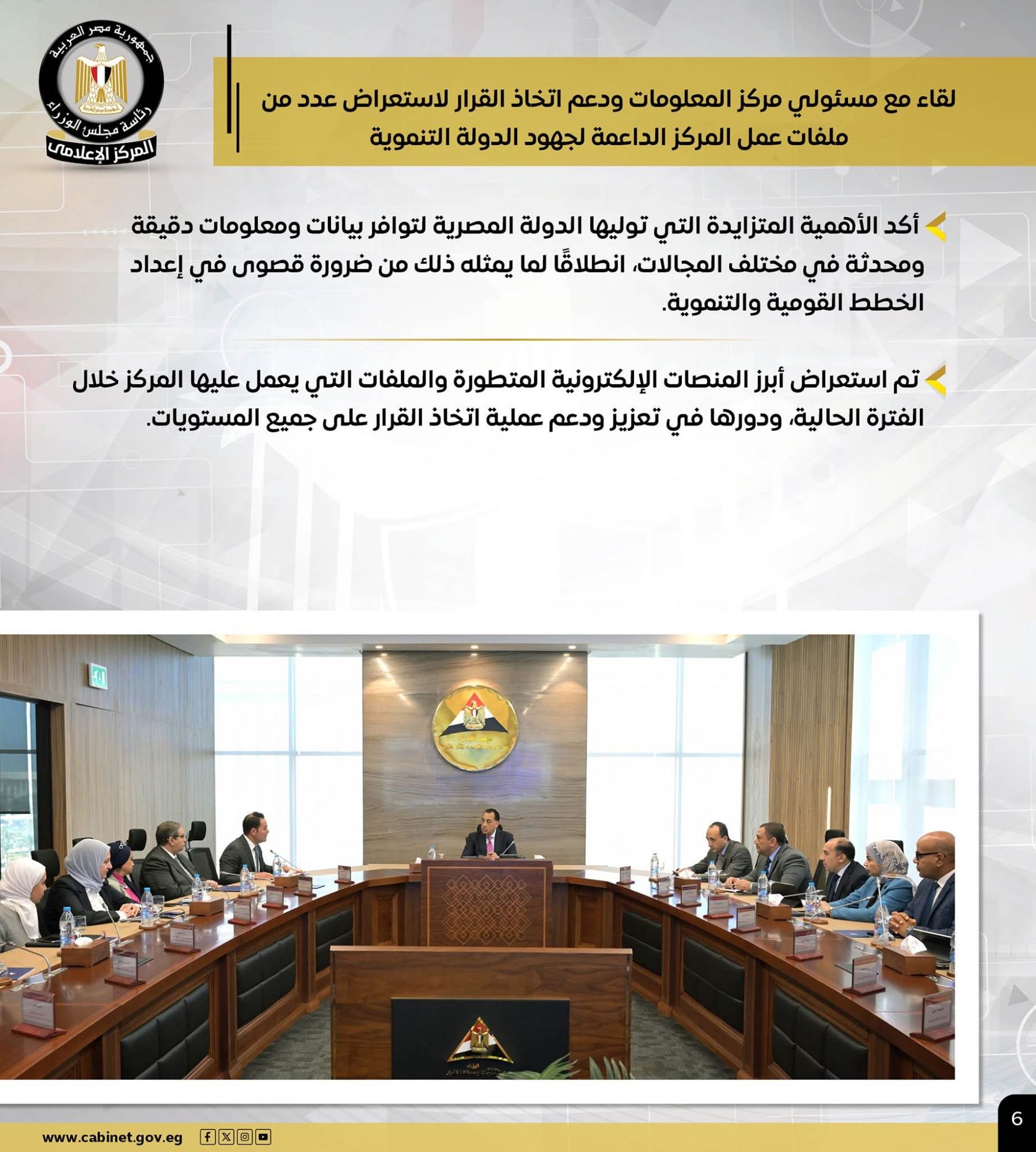 والتقى رئيس الوزراء مسئولي مركز المعلومات ودعم اتخاذ القرار لاستعراض عدد من ملفات عمل المركز الداعمة لجهود الدولة التنموية، حيث أكد الأهمية المتزايدة التي توليها الدولة المصرية لتوافر بيانات ومعلومات دقيقة ومحدثة في مختلف المجالات، انطلاقًا لما يمثله ذلك من ضرورة قصوى في إعداد الخطط القومية والتنموية.