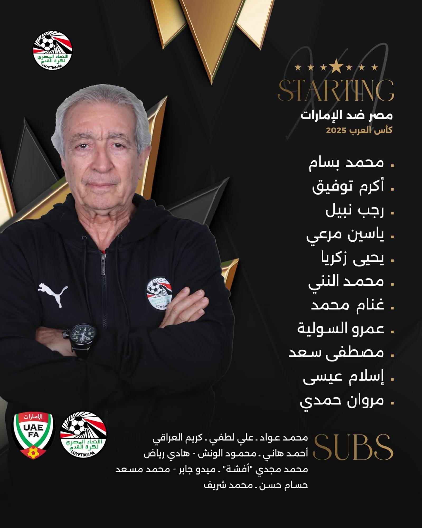 أعلن حلمي طولان المدير الفني لمنتخب مصر الثاني لكرة القدم تشكيل المنتخب لمواجهة الإمارات في الثامنة والنصف مساء اليوم علي ملعب لوسيل في إطار الجولة الثانية للمجموعة الثالثة ببطولة كاس العرب والمقامة في قطر حتى يوم 18 ديسمبر الجاري.