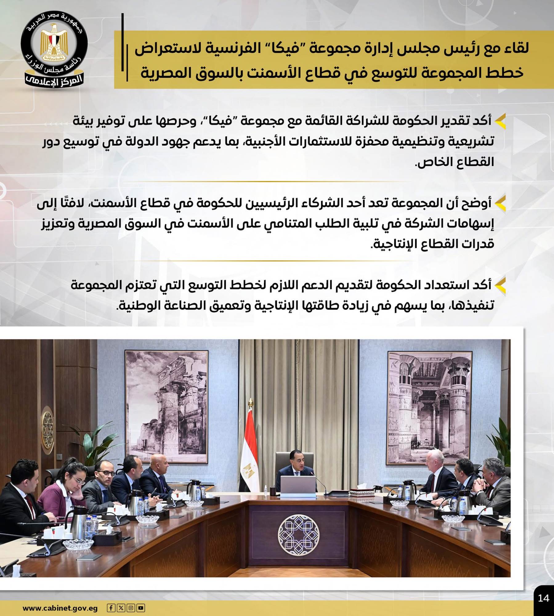 وشملت الأنشطة لقاء سيادته مع رئيس مجلس إدارة مجموعة "فيكا" الفرنسية، لاستعراض خطط المجموعة للتوسع في قطاع الأسمنت بالسوق المصرية، مؤكدًا تقدير الحكومة للشراكة القائمة مع المجموعة وحرصها على توفير بيئة تشريعية وتنظيمية محفزة للاستثمارات الأجنبية وتوسيع دور القطاع الخاص، موضحًا أن المجموعة تعد أحد الشركاء الرئيسيين للحكومة في قطاع الأسمنت، مؤكدًا استعداد الحكومة لتقديم الدعم اللازم لخطط التوسع التي تعتزم المجموعة تنفيذها، لزيادة طاقتها الإنتاجية وتعميق الصناعة الوطنية.