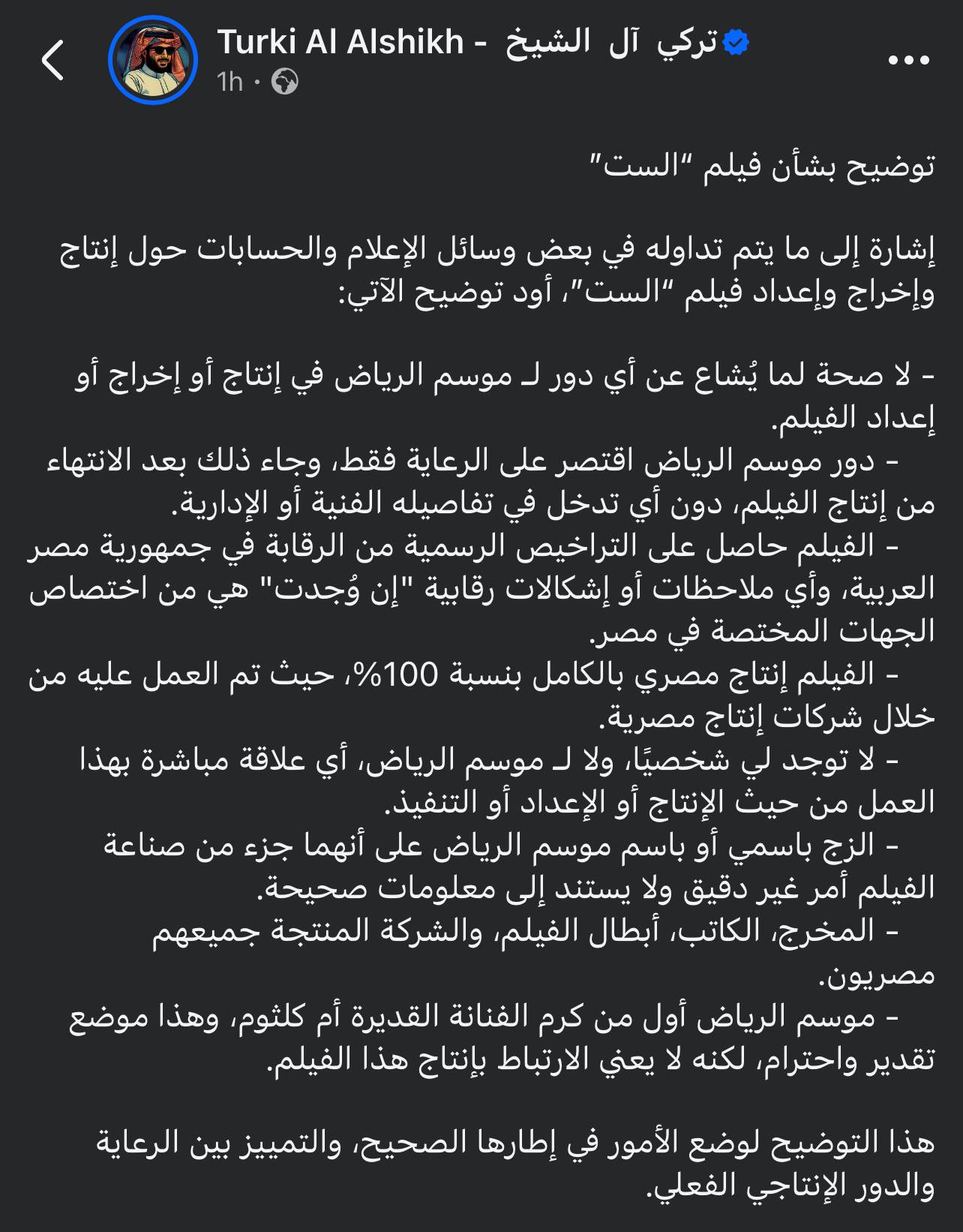 - الزج باسمي أو باسم موسم الرياض على أنهما جزء من صناعة الفيلم أمر غير دقيق ولا يستند إلى معلومات صحيحة.