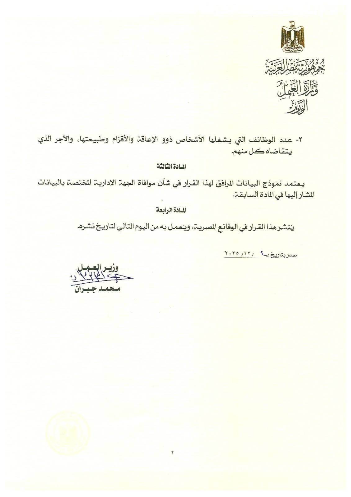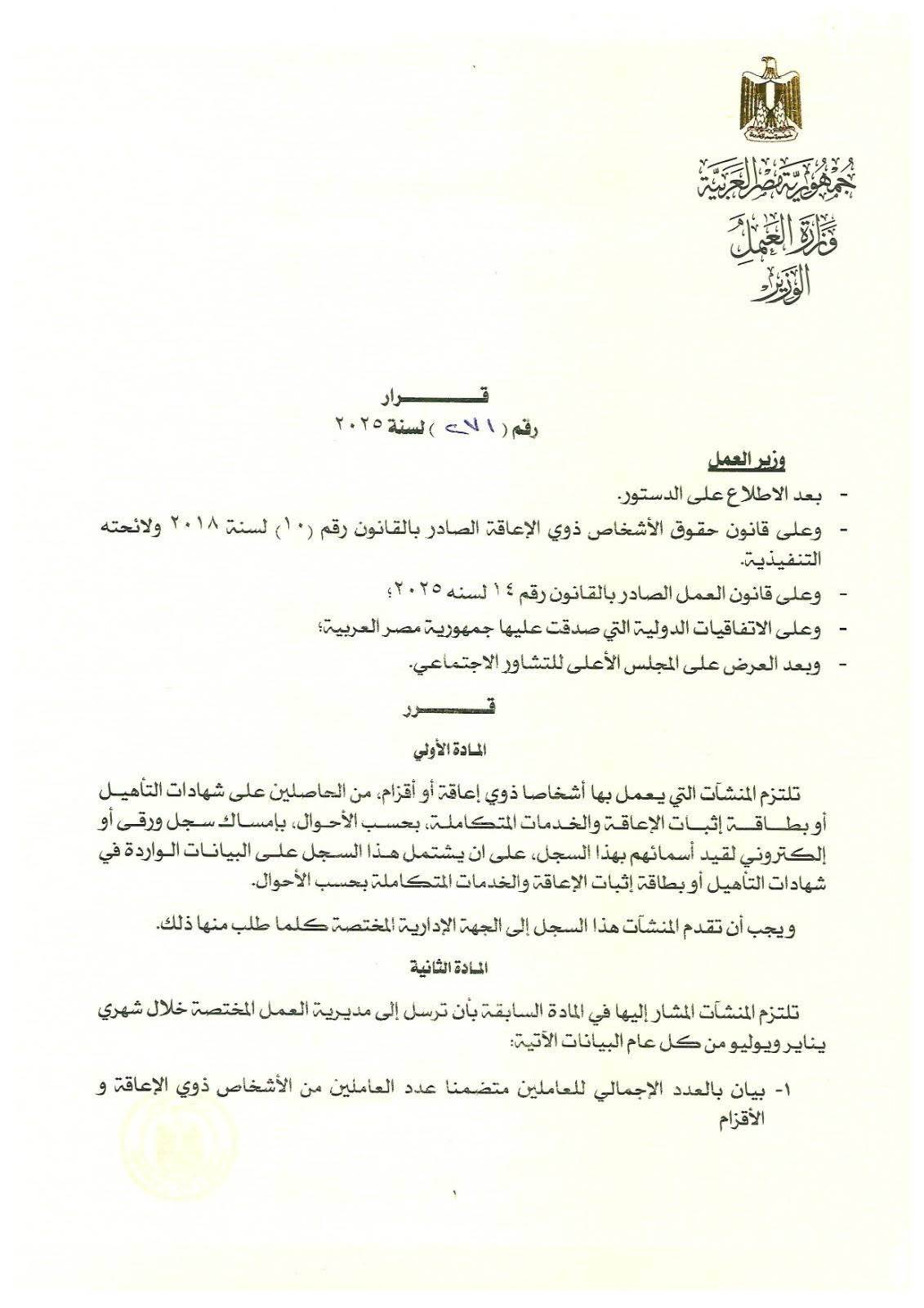 وزير العمل يصدر قرارًا وزاريًا رقم (271) لسنة 2025 بشأن تنظيم تشغيل الأشخاص ذوي الإعاقة والأقزام بالمنشآت