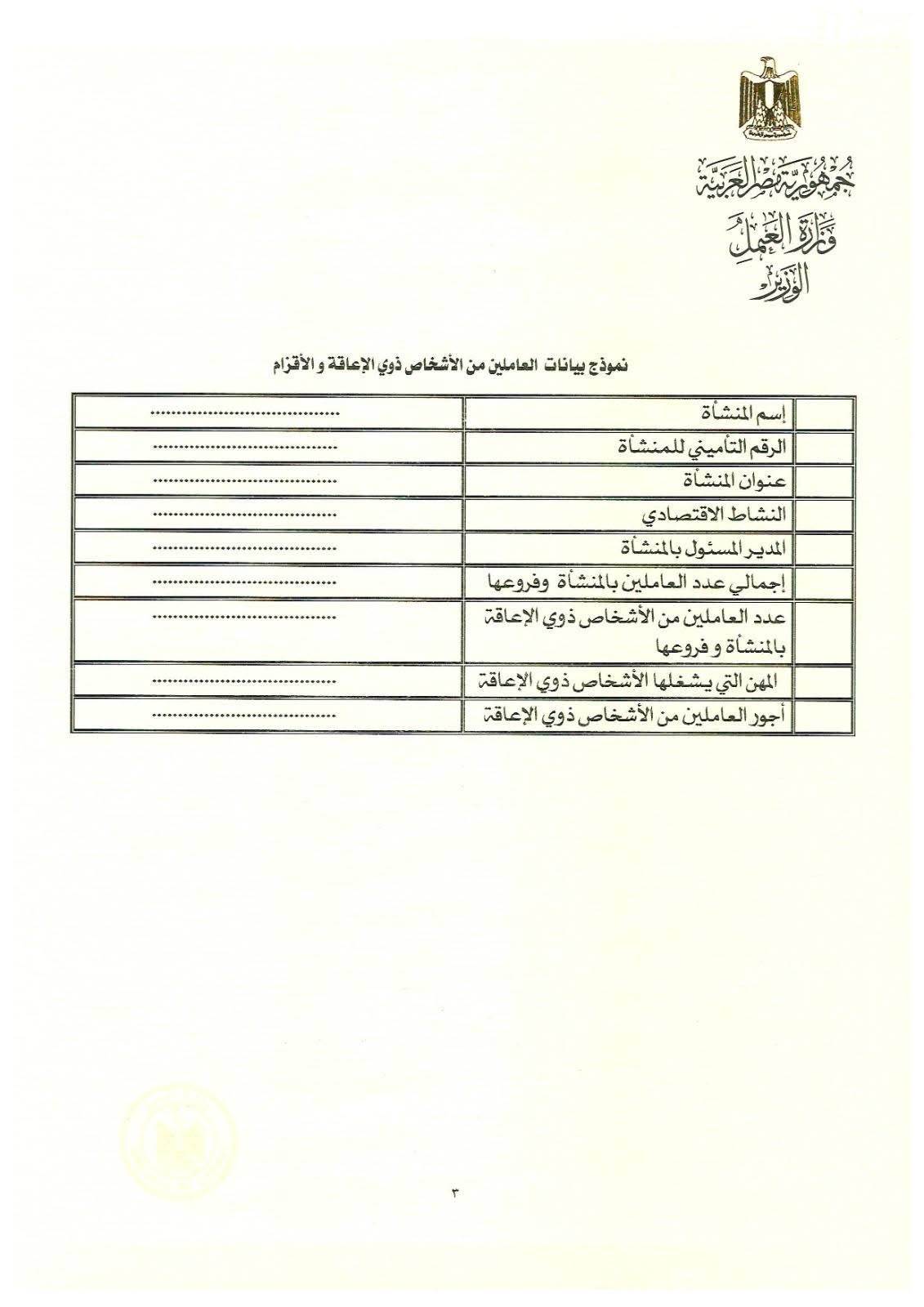 ويهدف هذا النموذج إلى توحيد آليات الحصر والرصد، وبناء قاعدة بيانات دقيقة على مستوى الجمهورية، بما يُسهم في متابعة الالتزام بنِسَب التشغيل المقررة قانونًا، وتعزيز دمج الأشخاص ذوي الإعاقة والأقزام في سوق العمل.
