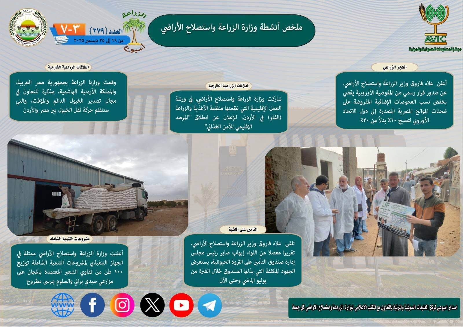أصدر مركز المعلومات الصوتية والمرئية بوزارة الزراعة واستصلاح الأراضي، "الانفوجراف الاسبوعي" في نسخته رقم 279 حول الحصاد الاسبوعي لأهم أنشطة الوزارة، خلال الاسبوع الماضي في الفترة من 19 وحتى 25 ديسمبر الجاري، كما أصدر المركز ايضا ملخصا بالفيديو، حول انشطة الوزارة خلال نفس الفترة.