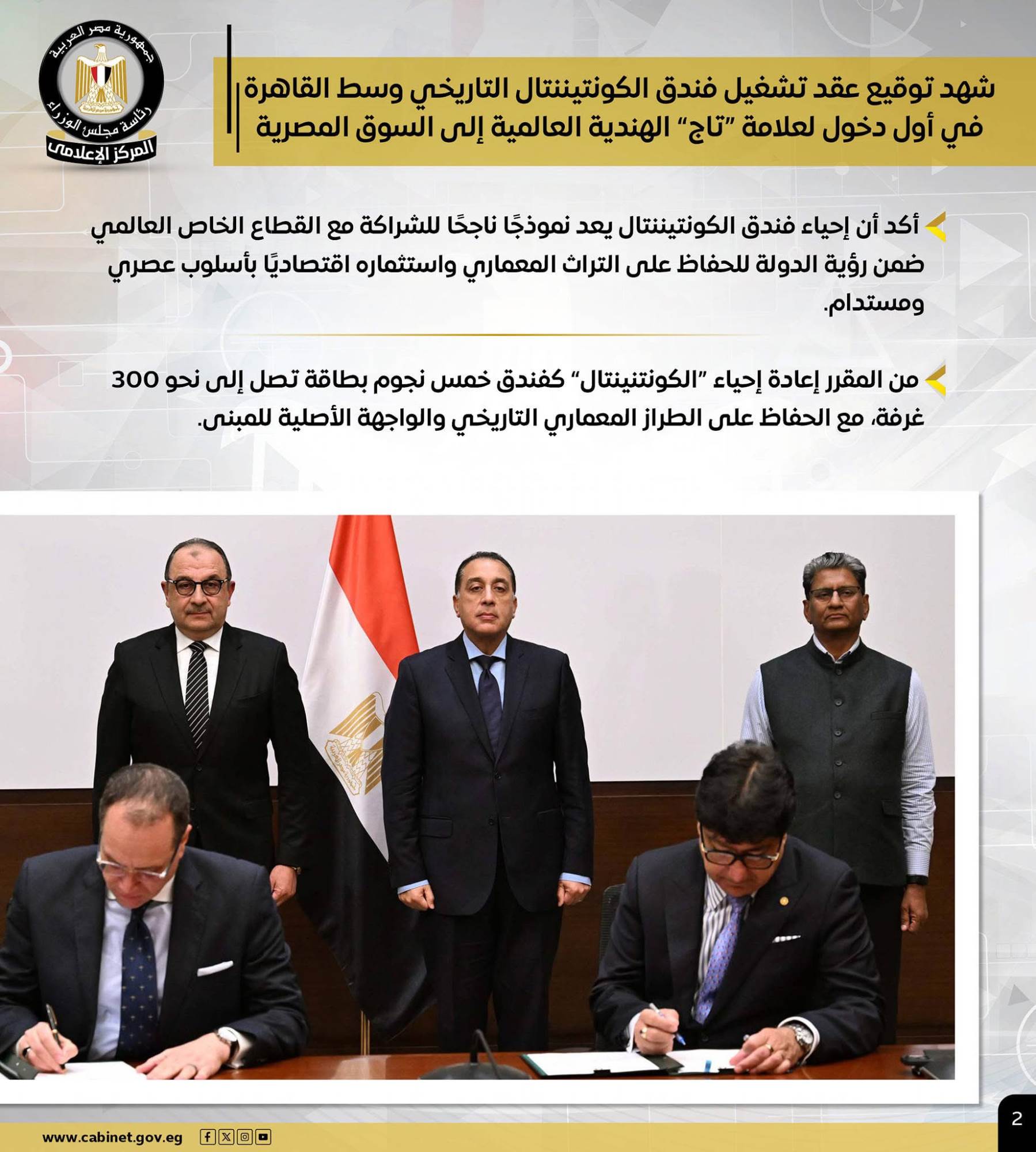 كما شهد رئيس الوزراء توقيع عقد تشغيل فندق "الكونتيننتال" التاريخي وسط القاهرة في أول دخول لعلامة "تاج" الهندية العالمية إلى السوق المصرية، مؤكدًا أن إحياء الفندق يعد نموذجًا ناجحًا للشراكة مع القطاع الخاص العالمي ضمن رؤية الدولة للحفاظ على التراث المعماري واستثماره اقتصاديًا بأسلوب عصري ومستدام.