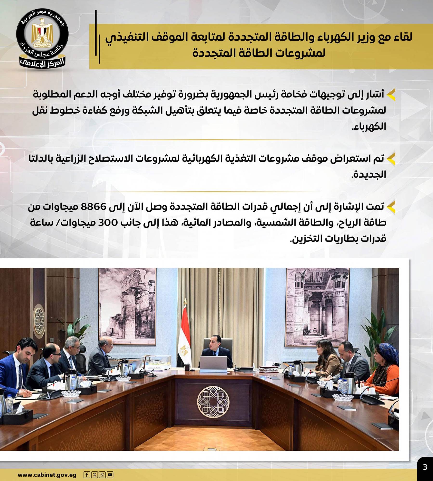 وشملت الأنشطة، لقاء رئيس الوزراء مع وزير الكهرباء لمتابعة الموقف التنفيذي لمشروعات الطاقة المتجددة، حيث أشار إلى التوجيهات الرئاسية بتوفير مختلف أوجه الدعم لمشروعات الطاقة المتجددة، خاصة فيما يتعلق بتأهيل الشبكة ورفع كفاءة خطوط نقل الكهرباء.