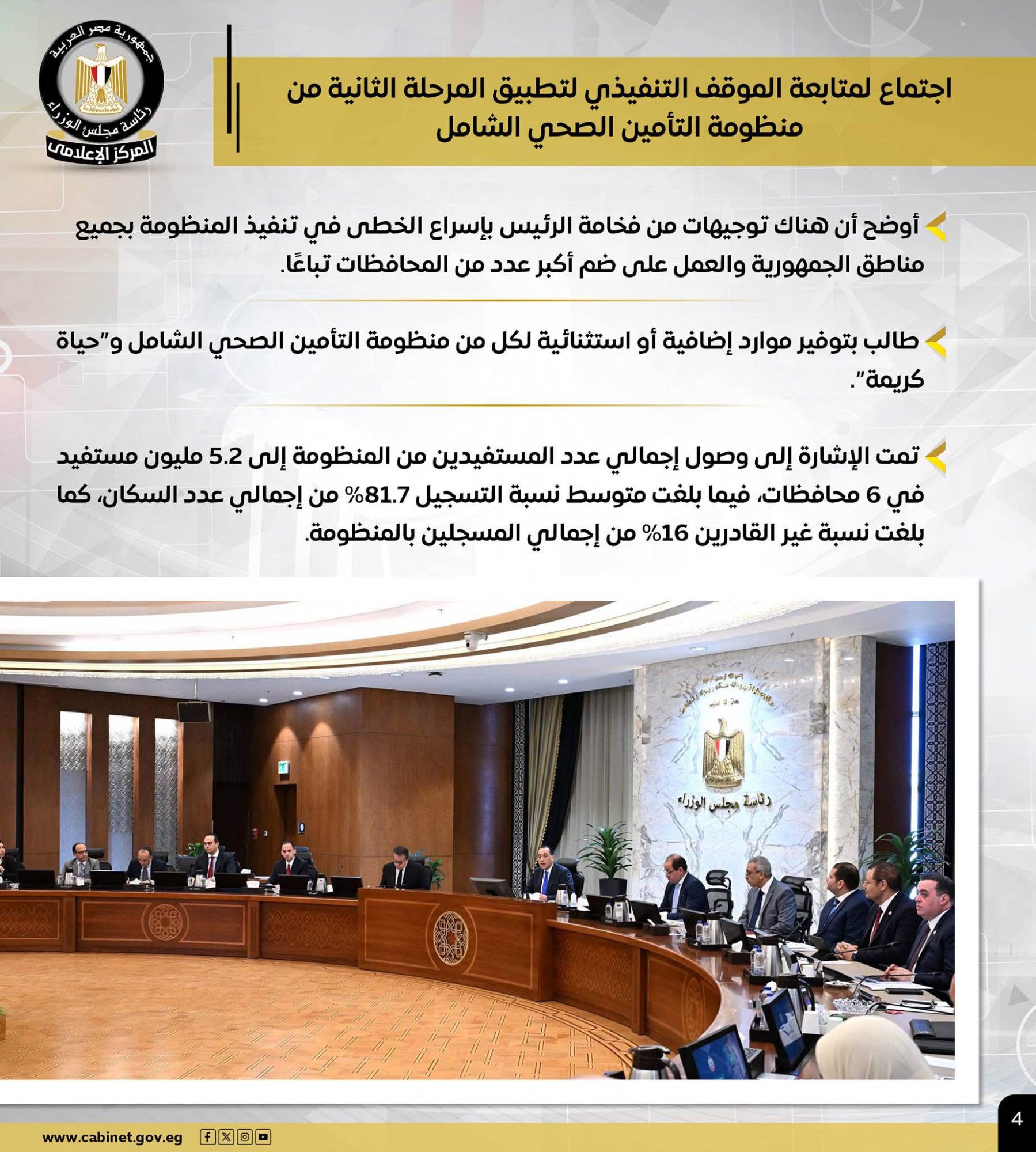 وتضمنت الأنشطة، اجتماع رئيس الوزراء لمتابعة الموقف التنفيذي لتطبيق المرحلة الثانية من منظومة التأمين الصحي الشامل، موضحًا أن هناك توجيهات رئاسية بإسراع الخطى في تنفيذ المنظومة بجميع مناطق الجمهورية، والعمل على ضم أكبر عدد من المحافظات تباعًا، كما طالب بتوفير موارد إضافية أو استثنائية لكل من منظومة التأمين الصحي الشامل و"حياة كريمة".
