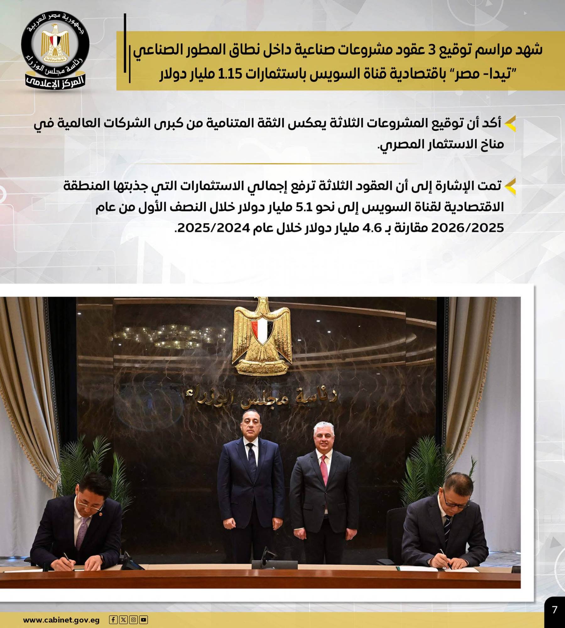 كما شهد رئيس الوزراء مراسم توقيع 3 عقود مشروعات صناعية داخل نطاق المطور الصناعي "تيدا- مصر" بـ "اقتصادية قناة السويس" باستثمارات 1.15 مليار دولار، وتمت الإشارة إلى أن العقود الثلاثة ترفع إجمالي الاستثمارات التي جذبتها المنطقة الاقتصادية لقناة السويس إلى نحو 5.1 مليار دولار خلال النصف الأول من عام 2025/2026.