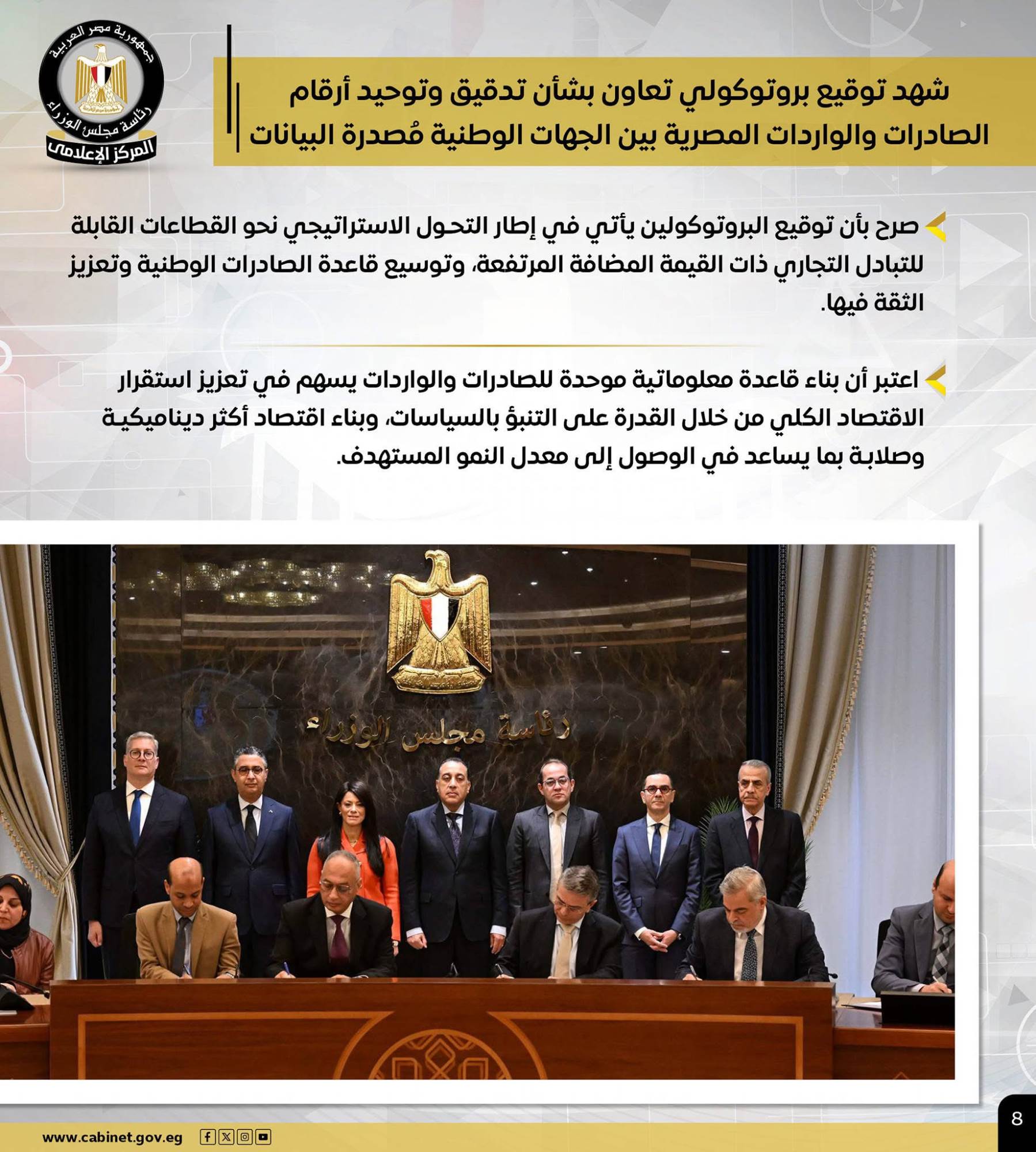 وفي نفس السياق، شهد رئيس الوزراء توقيع بروتوكولي تعاون بشأن تدقيق وتوحيد أرقام الصادرات والواردات المصرية بين الجهات الوطنية مُصدرة البيانات، حيث صرح بأن توقيع البروتوكولين يأتي في إطار التحـول الاستراتيجي نحو القطاعات القابلة للتبادل التجاري ذات القيمة المضافة المرتفعة، وتوسيع قاعدة الصادرات الوطنية وتعزيز الثقة فيها.