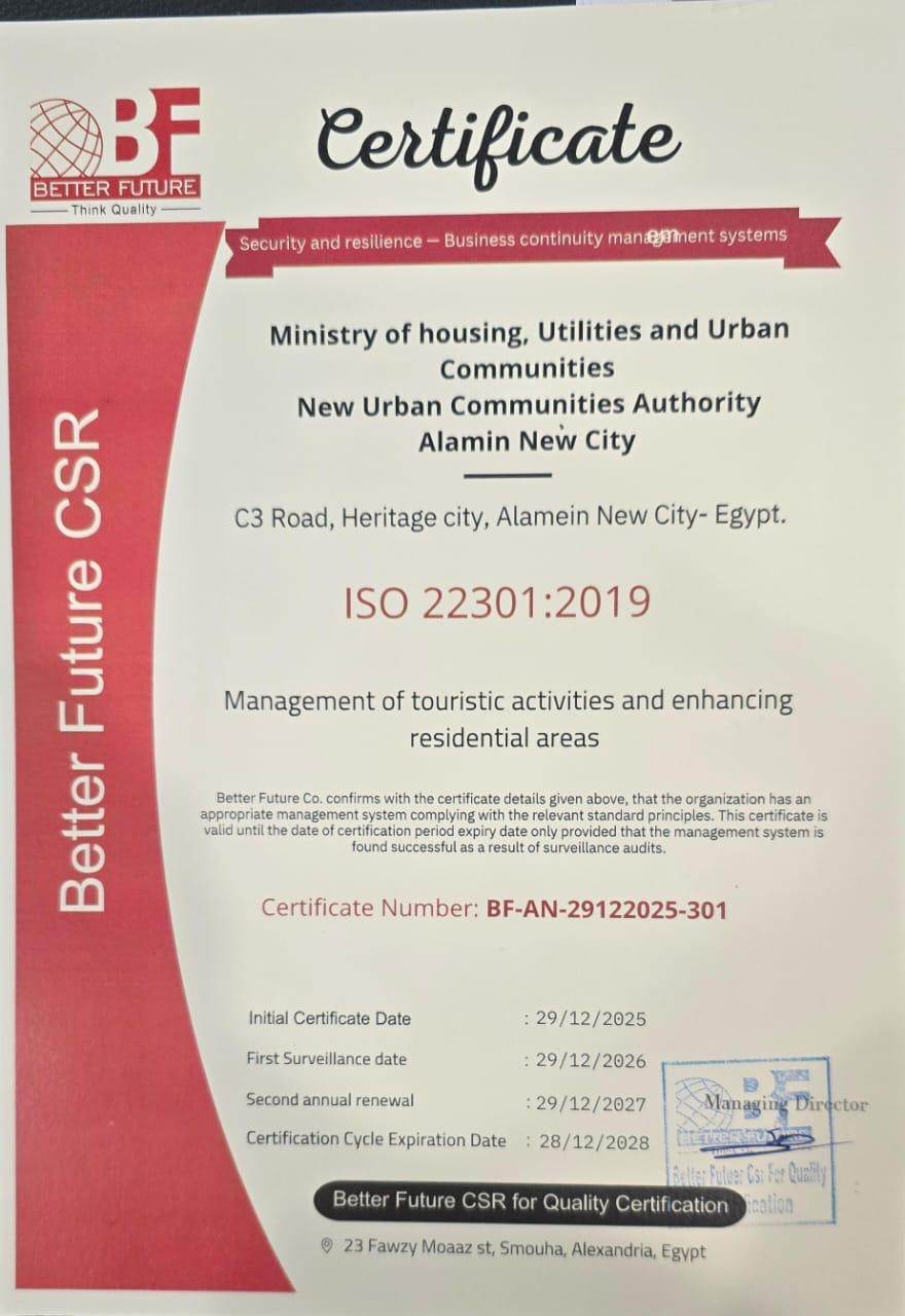 ومن جانبه أكد الدكتور مهندس محمد خلف الله رئيس جهاز مدينة العلمين الجديدة والمشرف على جهاز القرى السياحية أن الحصول على شهادة الأيزو الدولية يُعد خطوة فارقة في مسيرة الجهاز، ويجسد إلتزامه الكامل بتطبيق أفضل الممارسات العالمية في إدارة الأزمات والمخاطر، وتحسين جودة الخدمات، ورفع كفاءة الأداء المؤسسي، بما يحقق أعلى معدلات الانضباط والشفافية والإستدامة. وأضاف أن هذا الإعتماد الدولي يأتي تنفيذًا لتوجيهات الدولة ووزارة الإسكان بالإرتقاء بمنظومة العمل داخل أجهزة المدن الجديدة، وتحويلها إلى مؤسسات إحترافية تُدار وفق نظم حديثة قادرة على مواكبة حجم المشروعات القومية والتنموية الكبرى التي تشهدها مدينة العلمين الجديدة.