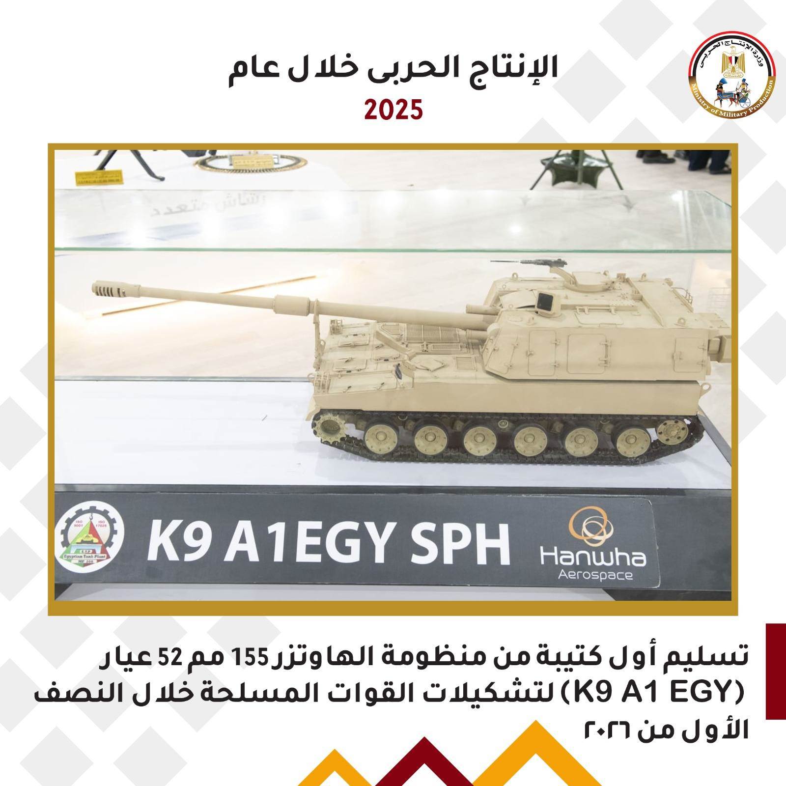 - • سيتم تسليم أول كتيبة من منظومة الهاوتزر 155 مم 52 عيار (K9 A1 EGY) لتشكيلات القوات المسلحة خلال النصف الأول من ۲۰۲٦
