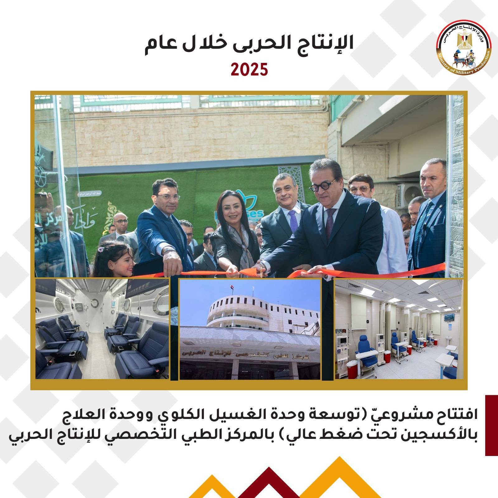 - • افتتاح مشروعيّ (توسعة وحدة الغسيل الكلوي ووحدة العلاج بالأكسجين تحت ضغط عالي) بالمركز الطبي التخصصي للإنتاج الحربي