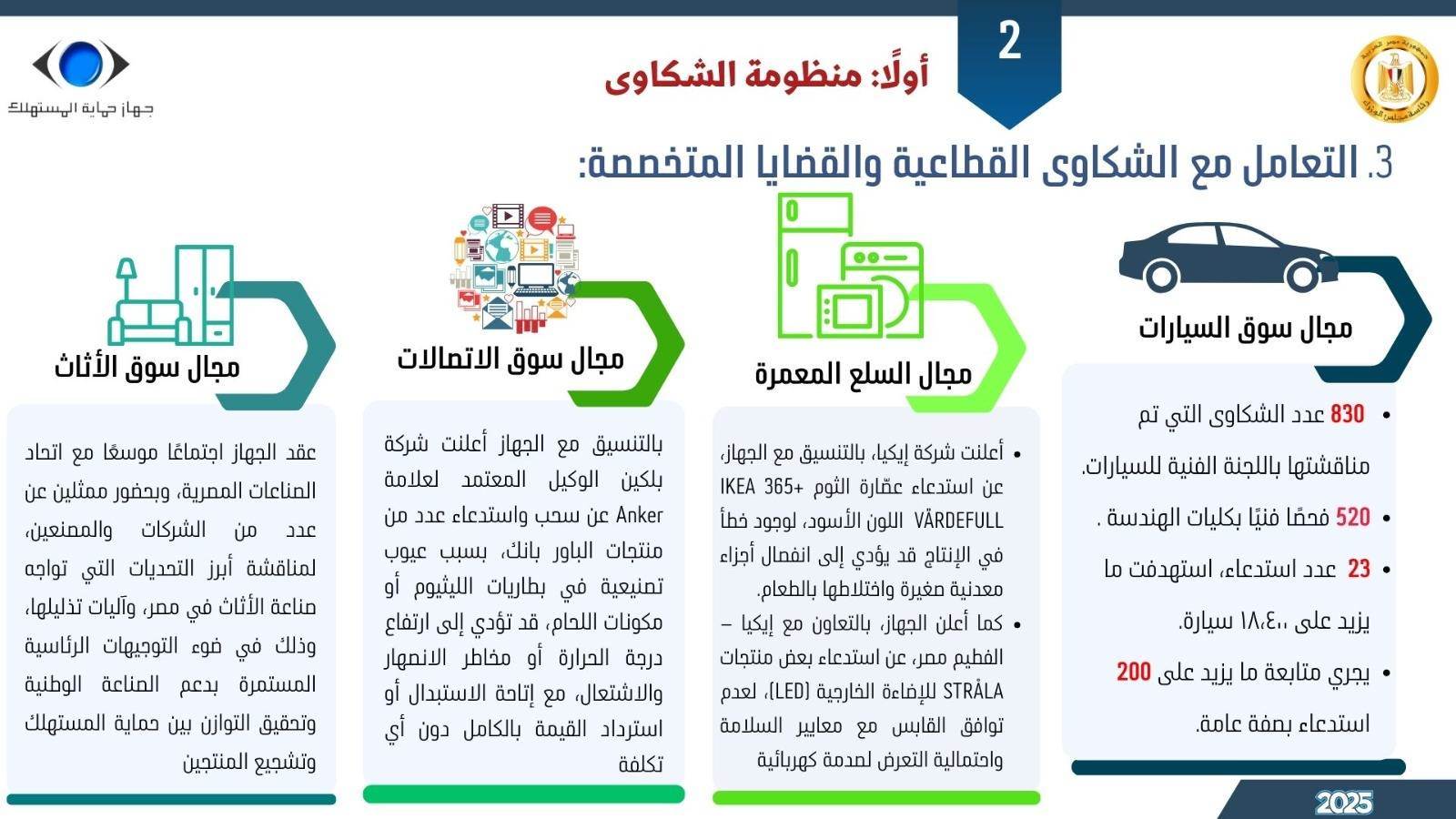 ففي مجال سوق السيارات، تم مناقشة 830 شكوى باللجنة الفنية للسيارات، وإجراء 520 فحصًا فنيًا بكليات الهندسة، كما ورد للجهاز 23 استدعاءً استهدفت أكثر من 18,400 سيارة، ويجري الجهاز حاليًا متابعة أكثر من 200 استدعاء بشكل عام في إطار إحكام الرقابة على سلامة المركبات وحماية المستهلكين، فيما بلغ إجمالي القرارات الملزمة الصادرة بشأن شكاوى السيارات 595 قرارًا.