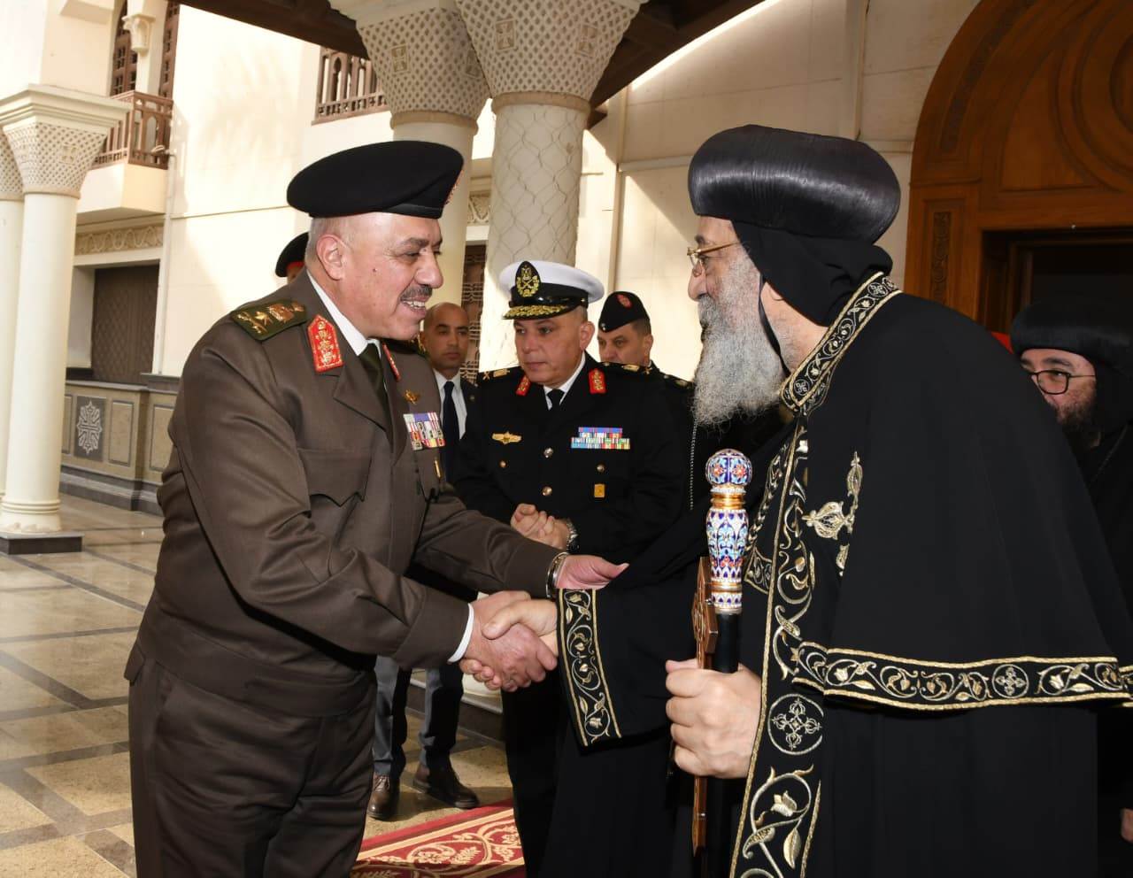 قام الفريق أول / عبد المجيد صقر القائد العام للقوات المسلحة وزير الدفاع والإنتاج الحربى يرافقه الفريق / أحمد خليفة رئيس أركان حرب القوات المسلحة وقادة الأفرع الرئيسية وعدد من قادة القوات المسلحة بتقديم التهنئة لقداسة البابا تواضروس الثانى بابا الإسكندرية وبطريرك الكرازة المرقسية بمناسبة عيد الميلاد المجيد وذلك بمقر الكاتدرائية المرقسية بالعباسية .