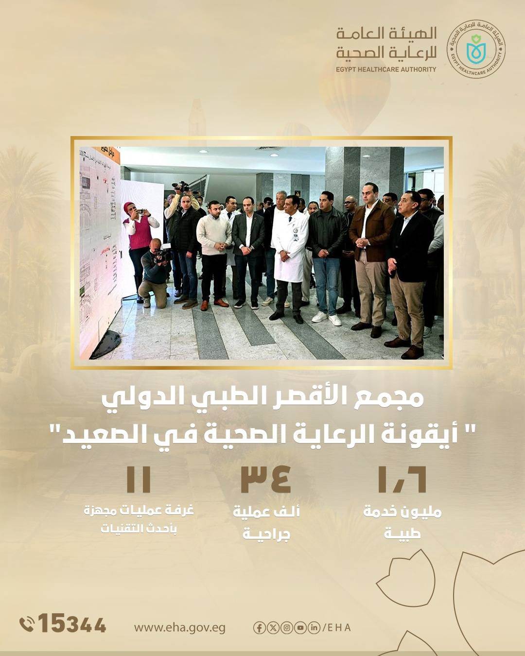 كما أبرز الإنفوجراف دور الهيئة في دعم السياحة العلاجية، حيث تم تقديم خدمات طبية عالية الجودة لـ 2500 سائح من 56 دولة تحت مظلة العلامة التجارية «نرعاك في مصر»، فضلًا عن الدور المحوري لـ مجمع الأقصر الطبي الدولي باعتباره أيقونة الرعاية الصحية في الصعيد، بعد تقديمه 1.6 مليون خدمة طبية، وإجراء أكثر من 34 ألف عملية جراحية داخل 11 غرفة عمليات مجهزة بأحدث التقنيات.