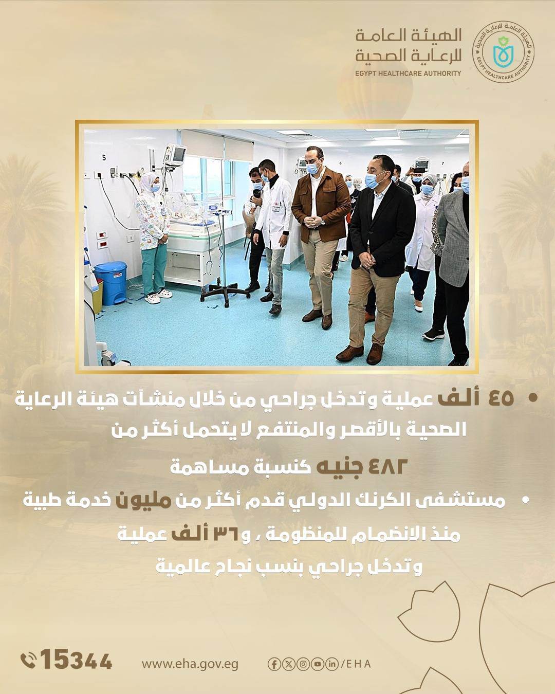 وأشار الانفوجراف إلى تنفيذ 45 ألف عملية وتدخل جراحي داخل منشآت هيئة الرعاية الصحية بالأقصر، مؤكدًا أن المنتفع لا يتحمل أكثر من 482 جنيهًا فقط كنسبة مساهمة، في إطار التزام المنظومة بالحماية المالية للمواطن.