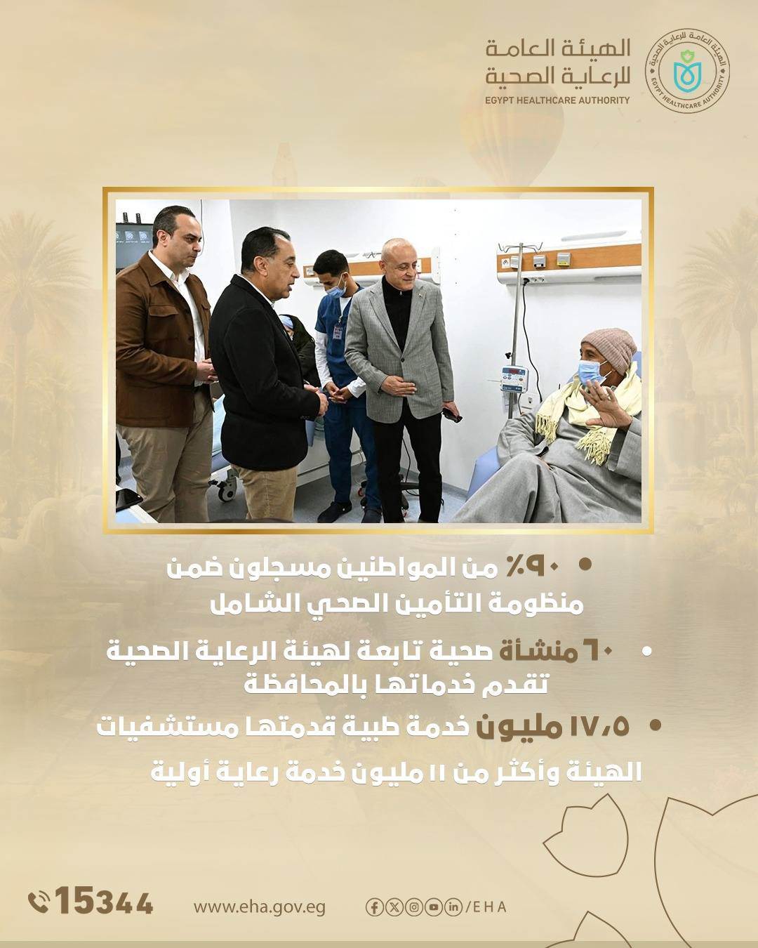وأكد الدكتور أحمد السبكي، رئيس الهيئة العامة للرعاية الصحية والمشرف العام على مشروع التأمين الصحي الشامل، أن 90% من مواطني محافظة الأقصر مسجلون ضمن منظومة التأمين الصحي الشامل بالمحافظة، ويتم تقديم الخدمات الصحية من خلال 60 منشأة صحية تابعة للهيئة بالمحافظة، موضحًا أن مستشفيات الهيئة قدمت 17.5 مليون خدمة طبية، إلى جانب أكثر من 11 مليون خدمة رعاية صحية أولية، بما يعكس اتساع نطاق التغطية وكفاءة تقديم الخدمة.