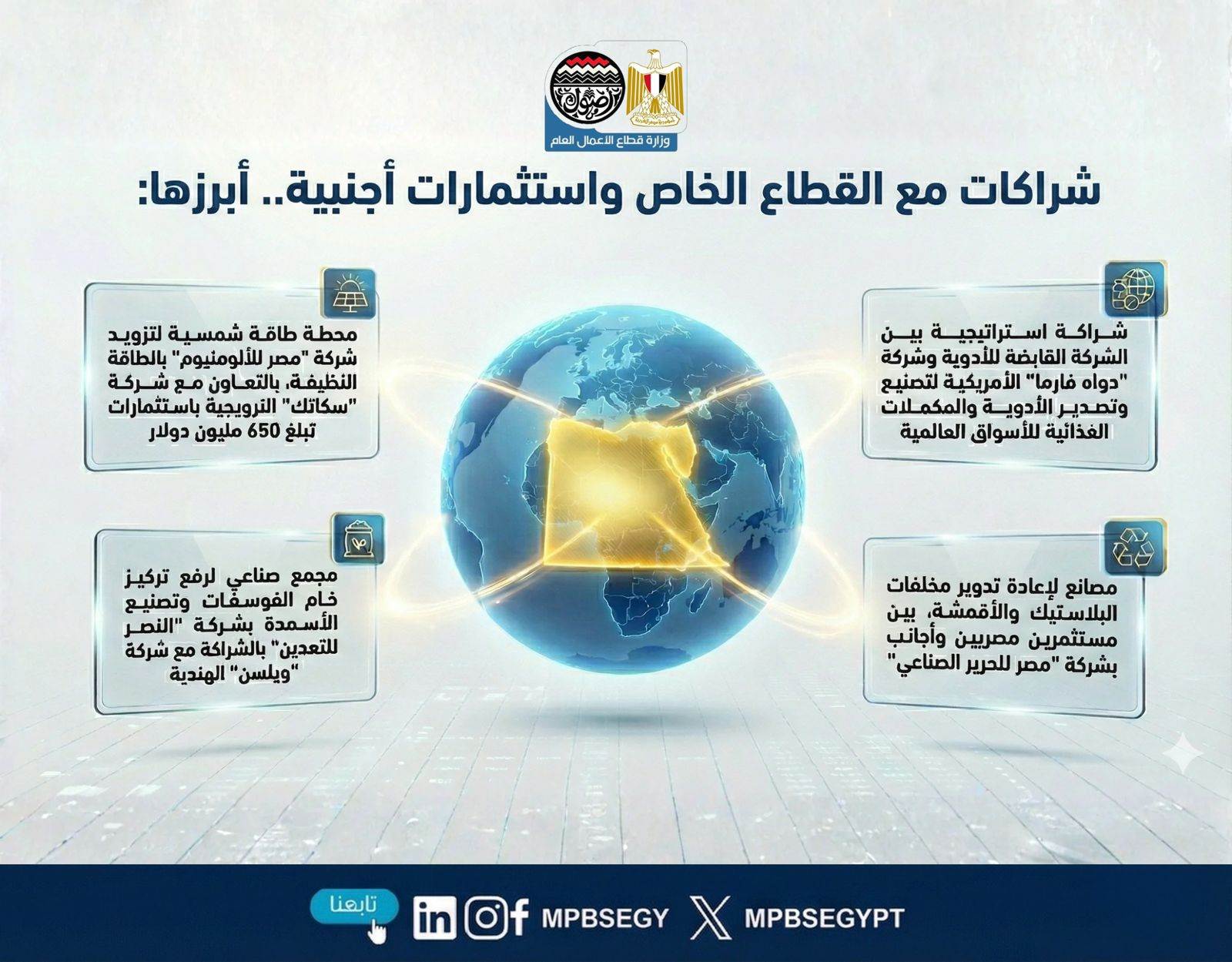 وفي سياق دعم الاستدامة وتعزيز الشراكات، تم إطلاق عدة شراكات استراتيجية مع القطاع الخاص واستثمارات أجنبية، من بينها مشروع إنشاء محطة طاقة شمسية لمجمع "مصر للألومنيوم" بالتعاون مع شركة "سكاتك" النرويجية باستثمارات 650 مليون دولار، وشراكة بين القابضة للأدوية وشركة دواه فارما الأمريكية لتصنيع وتصدير الأدوية والمكملات الغذائية إلى الأسواق العالمية، إلى جانب مشروع مجمع صناعي للفوسفات وتصنيع الأسمدة بشركة النصر للتعدين مع "ويلسن" الهندية، ومشروع إقامة مصانع لإعادة تدوير مخلفات البلاستيك والأقمشة بشركة مصر للحرير الصناعي بالتعاون مع مستثمرين مصريين وأجانب، بما يعكس توجه الدولة نحو تعظيم الاستفادة من الأصول وتحقيق نمو مستدام.