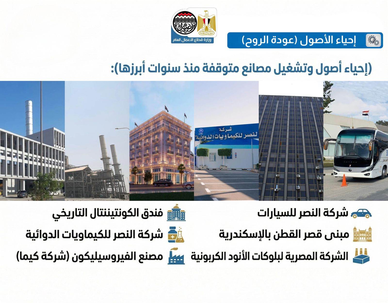 وفي إطار إحياء الأصول وعودة الروح للمصانع المتوقفة، تم إعادة تشغيل عدد من الكيانات المهمة بعد سنوات من التوقف، أبرزها شركة النصر للسيارات، وشركة النصر للكيماويات الدوائية، والشركة المصرية لبلوكات الأنود الكربونية، ومصنع الفيروسيليكون بشركة كيما، ومشروع إحياء فندق الكونتيننتال التاريخي، إلى جانب مشروع تعظيم الاستفادة من مبنى قصر القطن بالإسكندرية. كما تسارعت وتيرة تنفيذ عدد من المشروعات الكبرى، ومنها المشروع القومي لتطوير صناعة الغزل والنسيج والذي يمتد في 7 محافظات، مع الانتهاء من تنفيذ وتشغيل مرحلته الأولى بنهاية 2024، والوصول إلى التجهيزات النهائية لتشغيل المرحلة الثانية مع تقدم العمل في المرحلة الثالثة، فضلًا عن تطوير 97 خط إنتاج بشركات القابضة للأدوية وفق معايير التصنيع الجيد (GMP)، وإدخال مستحضرات جديدة وإحياء أخرى متوقفة، وتحديث صناعة السيارات بشركة النصر مع تطوير شامل لمصنع الملاكي بأحدث خطوط الإنتاج، وتطوير مصنع الأتوبيس والتوسع في إنتاج أتوبيسات "نصر سكاي" ورفع نسبة المكون المحلي إلى 63.5%، وإطلاق ميني باص "نصر ستار" بنسبة مكون محلي تجاوزت 70%، والاستعداد لإنتاج المركبات الكهربائية.