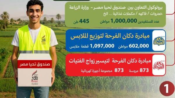 كما شهد التعاون بين صندوق تحيا مصر ووزارة الزراعة توزيع 445 طنًا من المساعدات المتنوعة، بما في ذلك الخضروات والفاكهة واللحوم والدواجن والأسماك، ووصلت هذه الجهود إلى نحو مليون مواطن في مختلف محافظات الجمهورية.