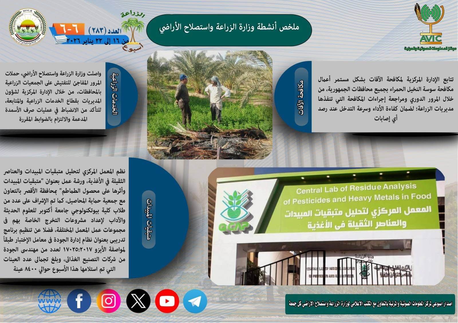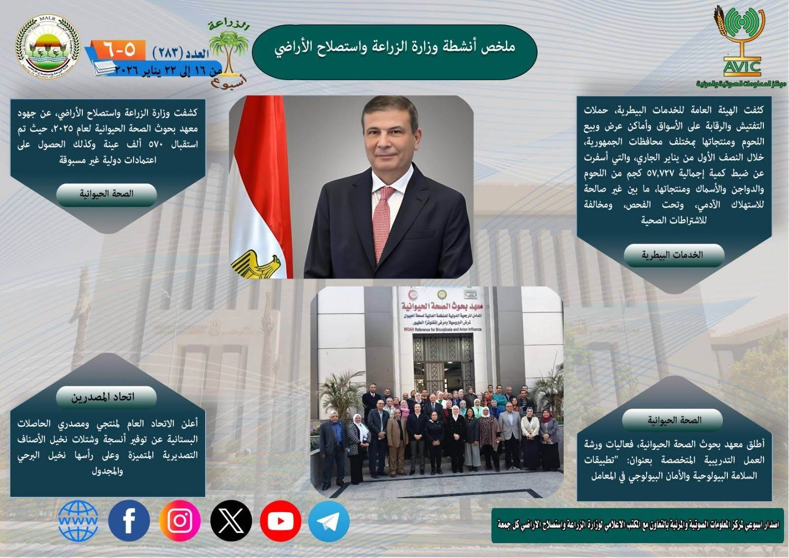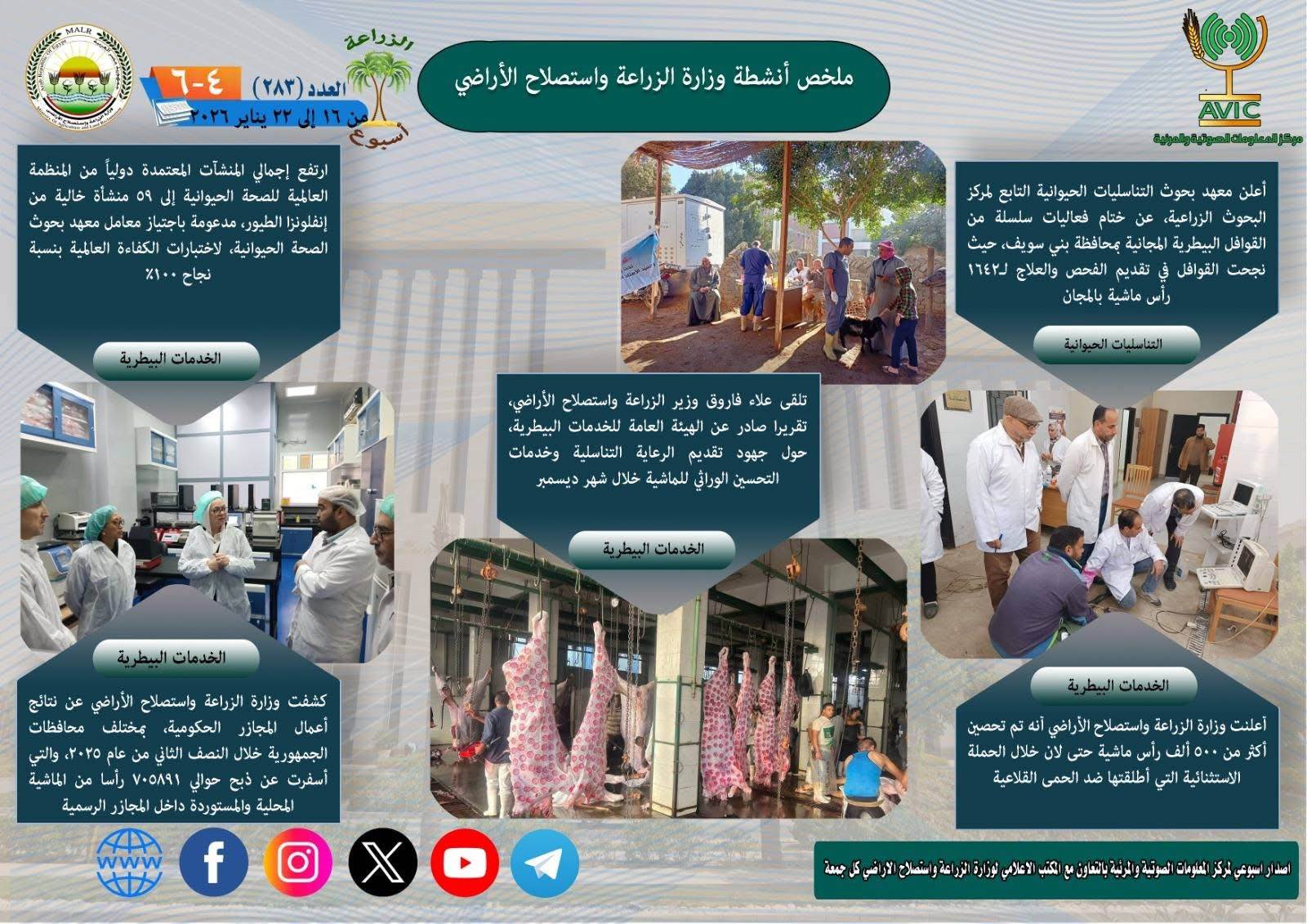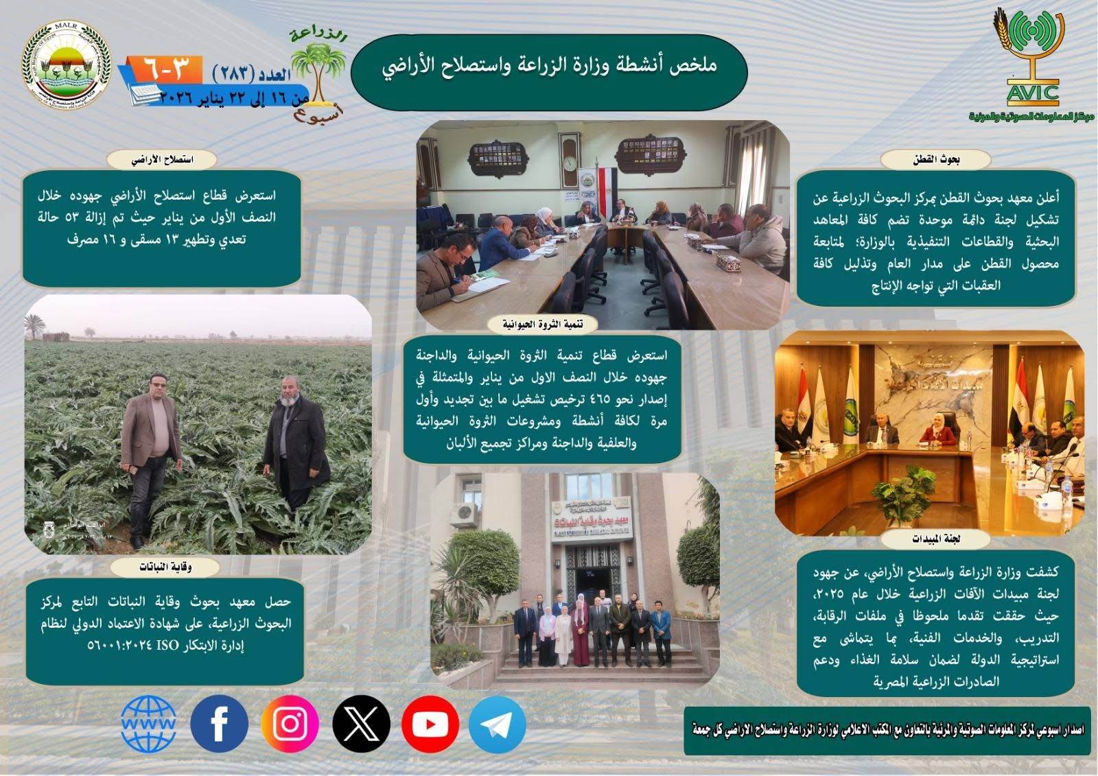 يذكر ان مركز المعلومات الصوتية والمرئية، والمكتب الاعلامي للوزارة، يصدران الجمعة من كل اسبوع، انفوجرافا وفيديو باسم: الزراعة في اسبوع، لالقاء الضوء على ملخص ما تم من انشطة وجهود، بكافة القطاعات والهيئات، التابعة للوزارة.