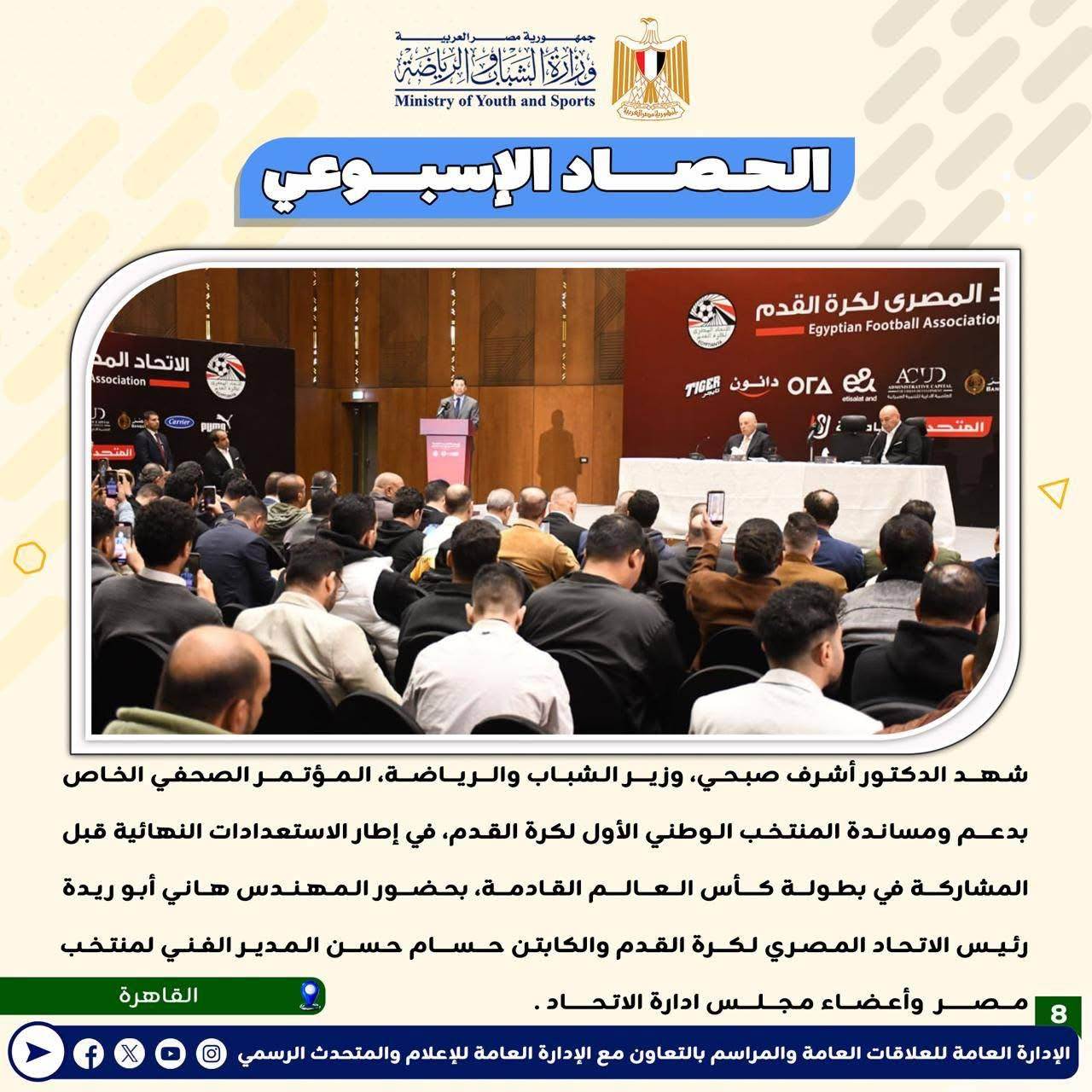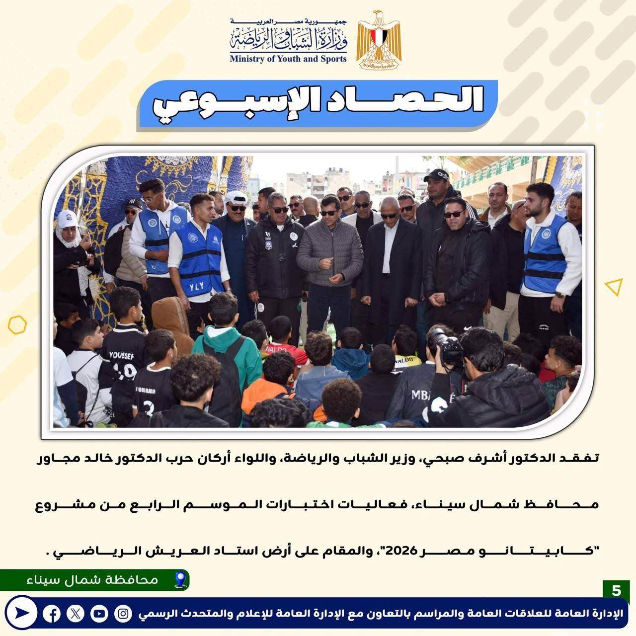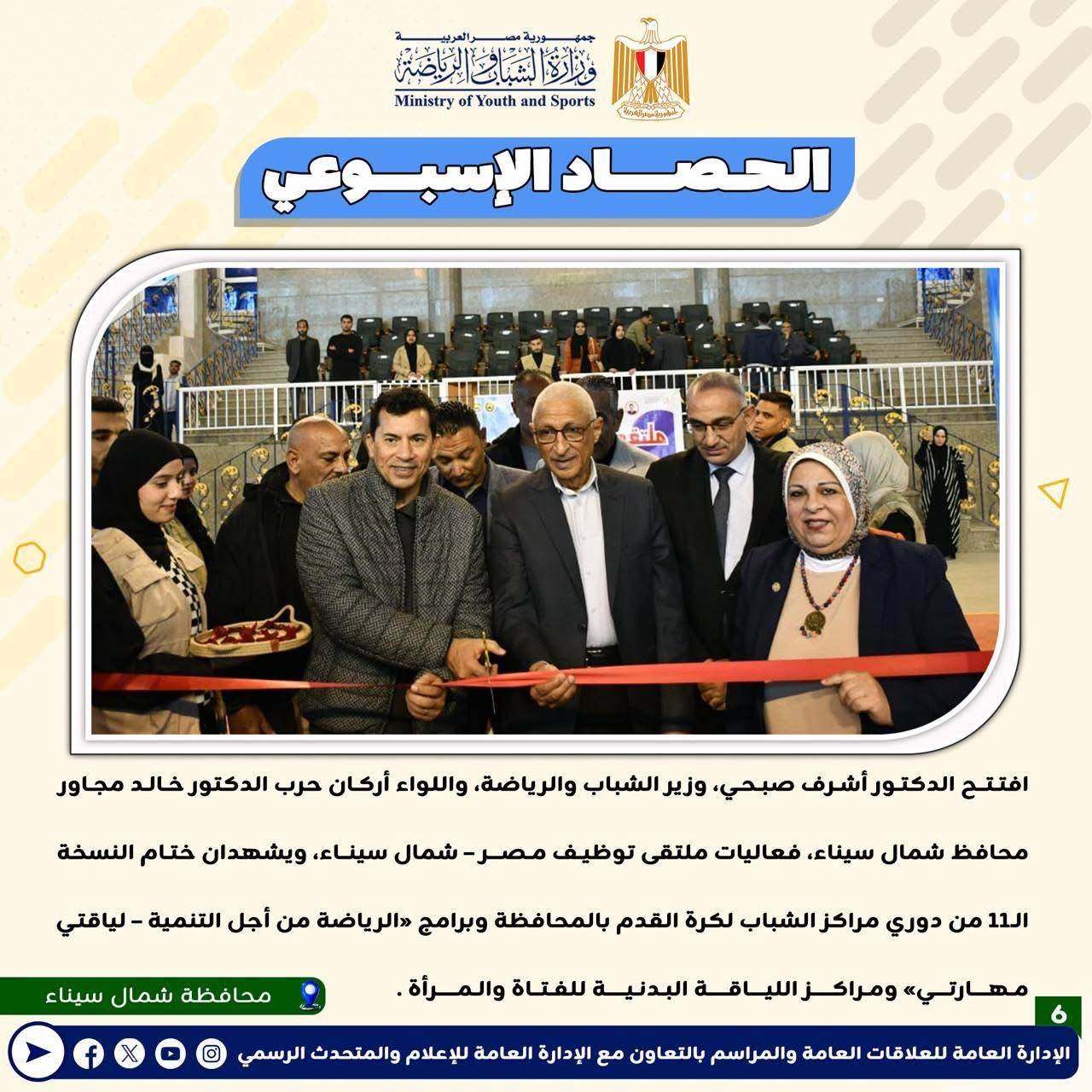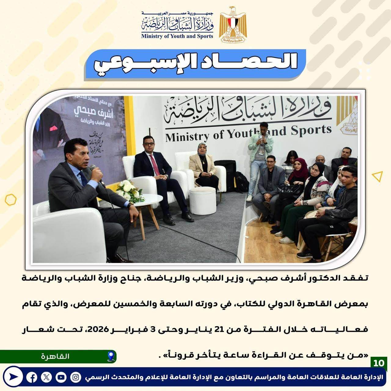 بالانفوجراف: وزارة الشباب والرياضة تصدر حصادها الأسبوعي لأهم أنشطة وبرامج وفعاليات الوزارة خلال الأسبوع المنقضي