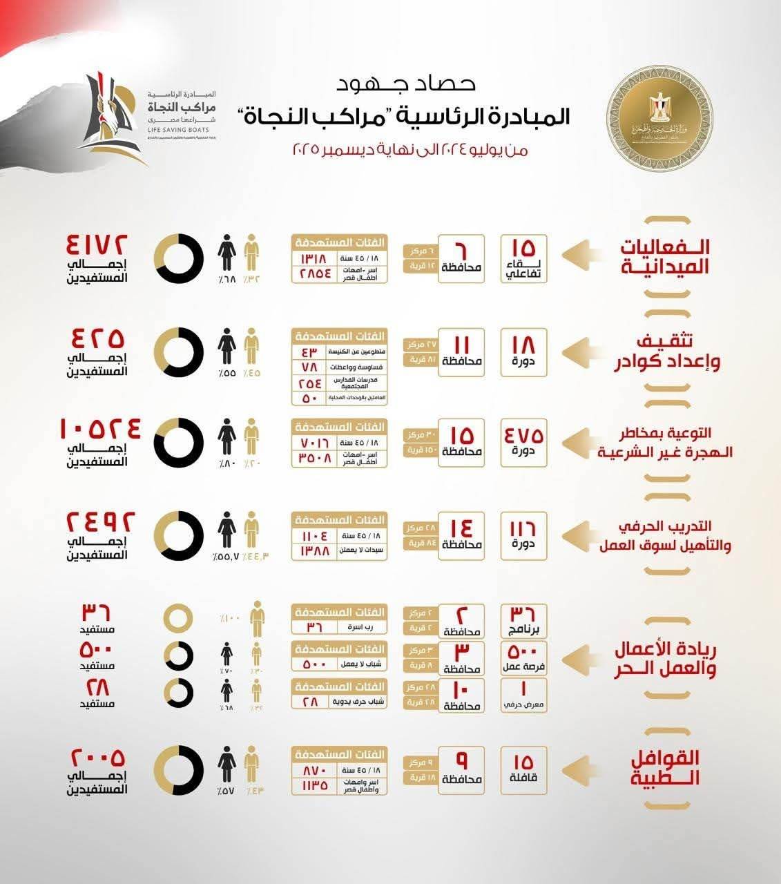 وفيما يلي رصد لحصاد فعاليات المبادرة خلال الفترة من ٤ يوليو ٢٠٢٤ وحتى نهاية عام ٢٠٢٥، من خلال تنفيذ حزمة واسعة من الأنشطة بالمحافظات والمراكز والقرى المستهدفة، بما يؤكد التزام الدولة بمعالجة الأسباب الجذرية للهجرة غير الشرعية ودعم الشباب وتمكينهم من بناء مستقبل أفضل.