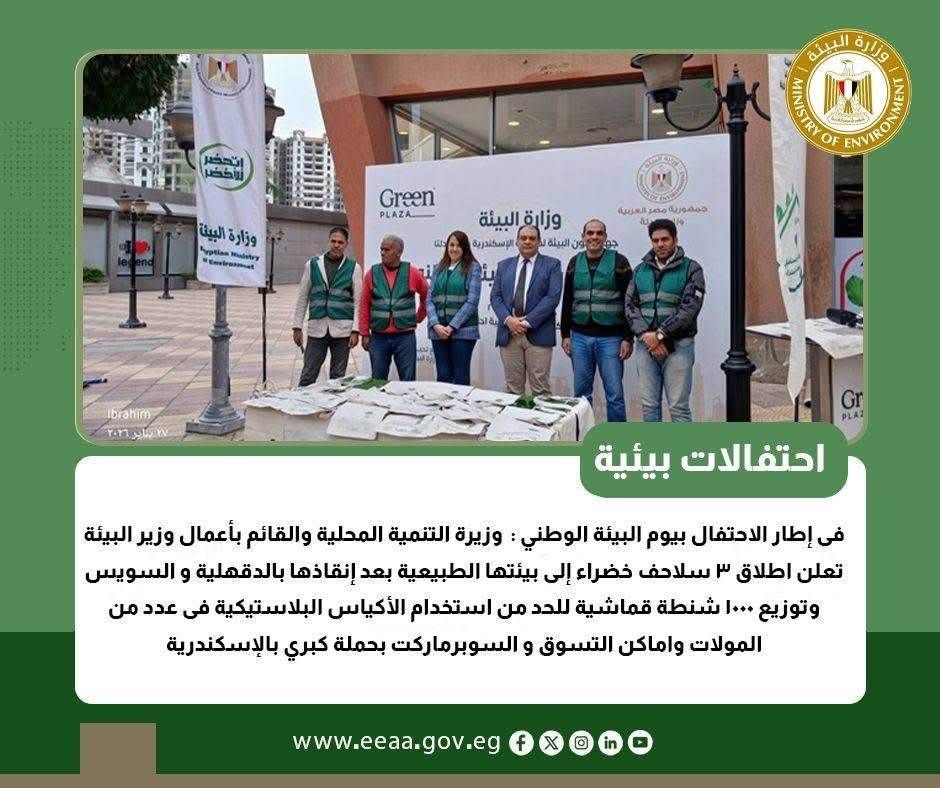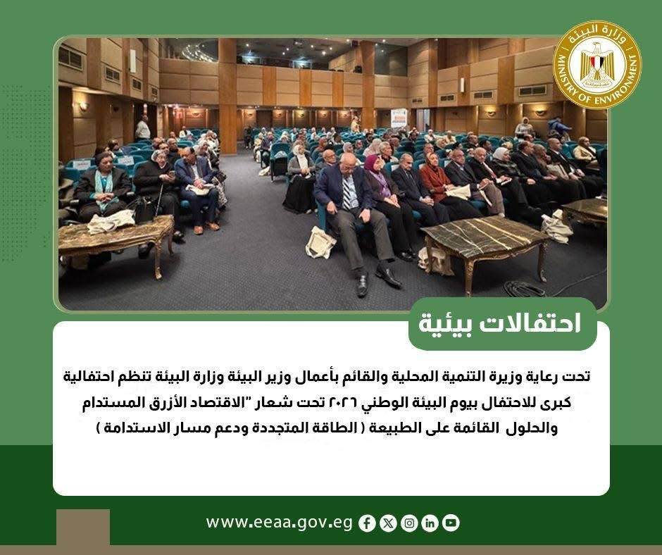 تحت رعاية وزيرة التنمية المحلية والقائم بأعمال وزير البيئة وزارة البيئة تنظم احتفالية كبرى للاحتفال بيوم البيئة الوطني ٢٠٢٦ تحت شعار "الاقتصاد الأزرق المستدام والحلول القائمة على الطبيعة ( الطاقة المتجددة ودعم مسار الاستدامة )، بمشاركة ممثلي الوزارات والهيئات والجمعيات الأهلية وكوكبة من الإعلامين في مصر ، وذلك بالمركز الثقافي التعليمي "بيت القاهرة ".
