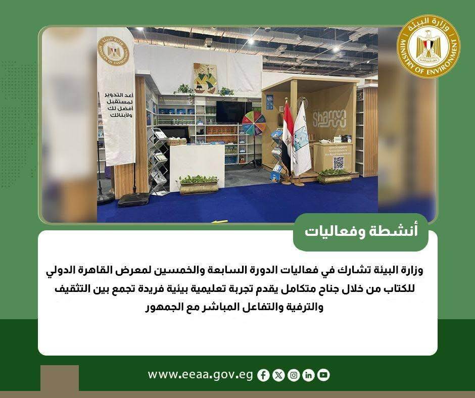 تنفيذا" لتوجيهات الدكتورة منال عوض ، وزيرة التنمية المحلية والقائم بأعمال وزير البيئة ، بمواصلة جهود رفع الوعي البيئي لدي المواطنين، شاركت وزارة البيئة في فعاليات الدورة السابعة والخمسين لمعرض القاهرة الدولي للكتاب من خلال جناح متكامل يقدم تجربة تعليمية بيئية فريدة تجمع بين التثقيف والترفية والتفاعل المباشر مع الجمهور.