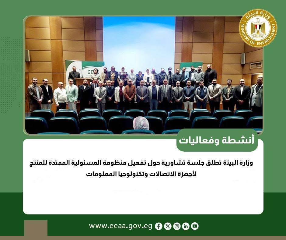 تنفيذا" لتوجيهات الدكتورة منال عوض وزيرة التنمية المحلية والقائم بأعمال وزيرة البيئة لدعم الجهود الرامية إلى تعزيز الإدارة المستدامة للمخلفات الإلكترونية والكهربائية، أطلقت وزارة البيئة من خلال جهاز تنظيم إدارة المخلفات، وبالتعاون مع مشروع إدارة تحسين الهواء وتغير المناخ بالقاهرة الكبرى، جلسة تشاورية تستهدف تفعيل منظومة المسئولية الممتدة للمنتِج لأجهزة الاتصالات وتكنولوجيا المعلومات، ومناقشة آليات تطبيقها مع جميع الأطراف المعنية حيث، وذلك بالمركز البيئي الثقافى التعليمى (بيت القاهرة) بالفسطاط.