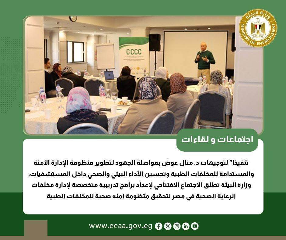 تنفيذا" لتوجيهات د. منال عوض بمواصلة الجهود لتطوير منظومة الإدارة الآمنة والمستدامة للمخلفات الطبية وتحسين الأداء البيئي والصحي داخل المستشفيات، وزارة البيئة تطلق من خلال مشروع" إدارة تلوث الهواء وتغير المناخ بالقاهرة الكبرى " الاجتماع الافتتاحي لإعداد برامج تدريبية متخصصة لإدارة مخلفات الرعاية الصحية في مصر لتحقيق متظومة آمنه صحية للمخلفات الطبية .
