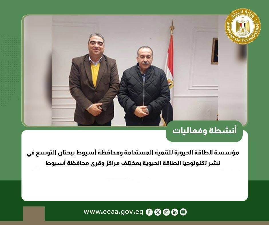 تنفيذا" لتوجيهات الدكتورة منال عوض وزيرة التنمية المحلية والقائم بأعمال وزير البيئة بدعم محافظات الصعيد في التحول إلى الأقتصاد الأخضر وتعزيز الاعتماد على مصادر الطاقة النظيفة، مؤسسة الطاقة الحيوية ومحافظة أسيوط يبحثان التوسع في نشر تكنولوجيا الطاقة الحيوية بمختلف مراكز وقرى محافظة أسيوط ، وذلك من خلال اجتماع اللواء الدكتور هشام أبو النصر محافظ أسيوط مع المهندس وائل رضوان المدير التنفيذي لمؤسسة الطاقة الحيوية للتنمية المستدامة بديوان عام المحافظة.