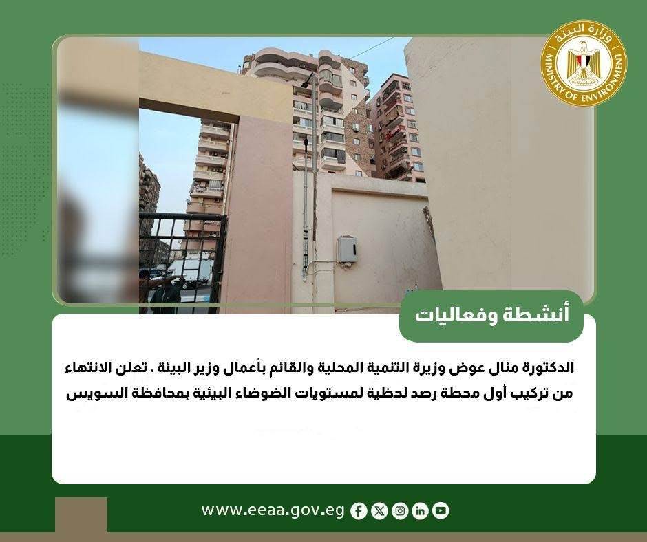 أعلنت الدكتورة منال عوض وزيرة التنمية المحلية والقائم بأعمال وزير البيئة ، الانتهاء من تركيب أول محطة رصد لحظية لمستويات الضوضاء البيئية بمحافظة السويس ، وذلك بمبني حي فيصل، وفي إطار تنفيذ خطة الحكومة لتحقيق مؤشرات ومستهدفات البعد البيئي ضمن استراتيجية التنمية المستدامة "رؤية مصر ٢٠٣٠ " وحرص الدولة على تحسين جودة البيئة والحفاظ على صحة المواطنين .