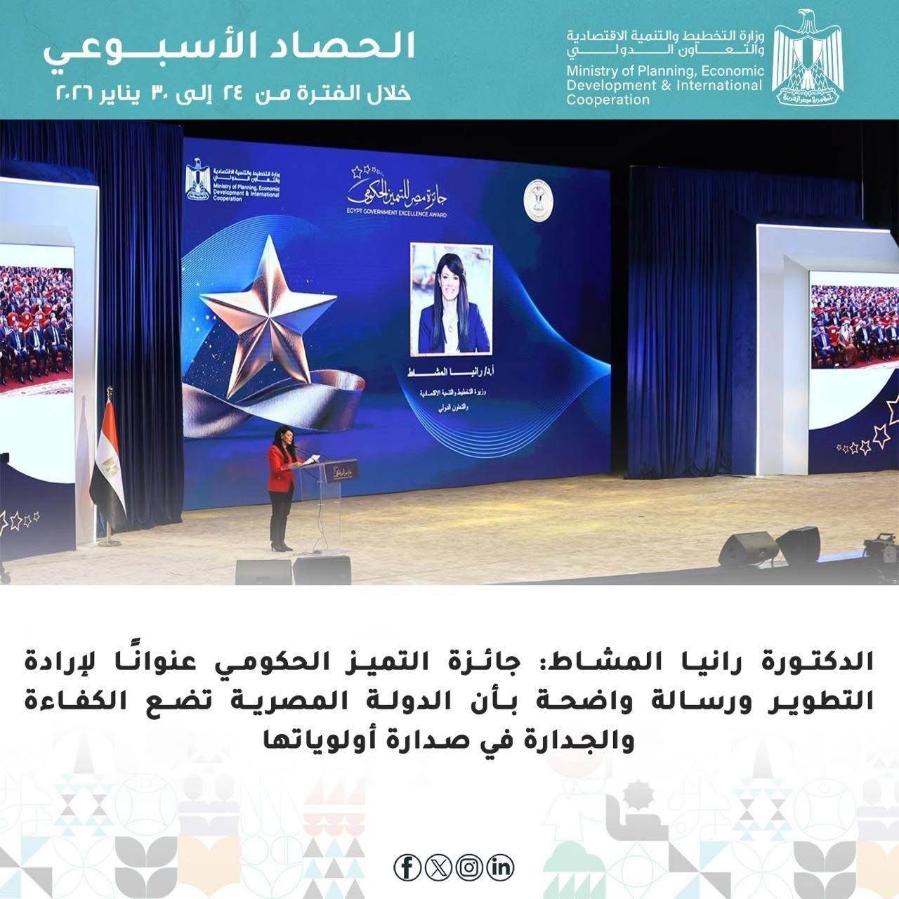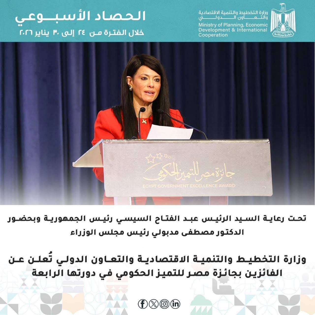 وخلال الأسبوع ألقت الدكتورة رانيا المشاط، وزيرة التخطيط والتنمية الاقتصادية والتعاون الدولي، الكلمة الافتتاحية لحفل "جوائز مصر للتميز الحكومي" في دورتها الرابعة، التي عقدت تحت رعاية الرئيس عبد الفتاح السيسي، رئيس الجمهورية، وبحضور الدكتور مصطفى مدبولي، رئيس مجلس الوزراء، وعدد من السادة الوزراء، وأعلنت الوزارة أسماء الفائزين بفئات جائزة مصر للتميز الحكومي.