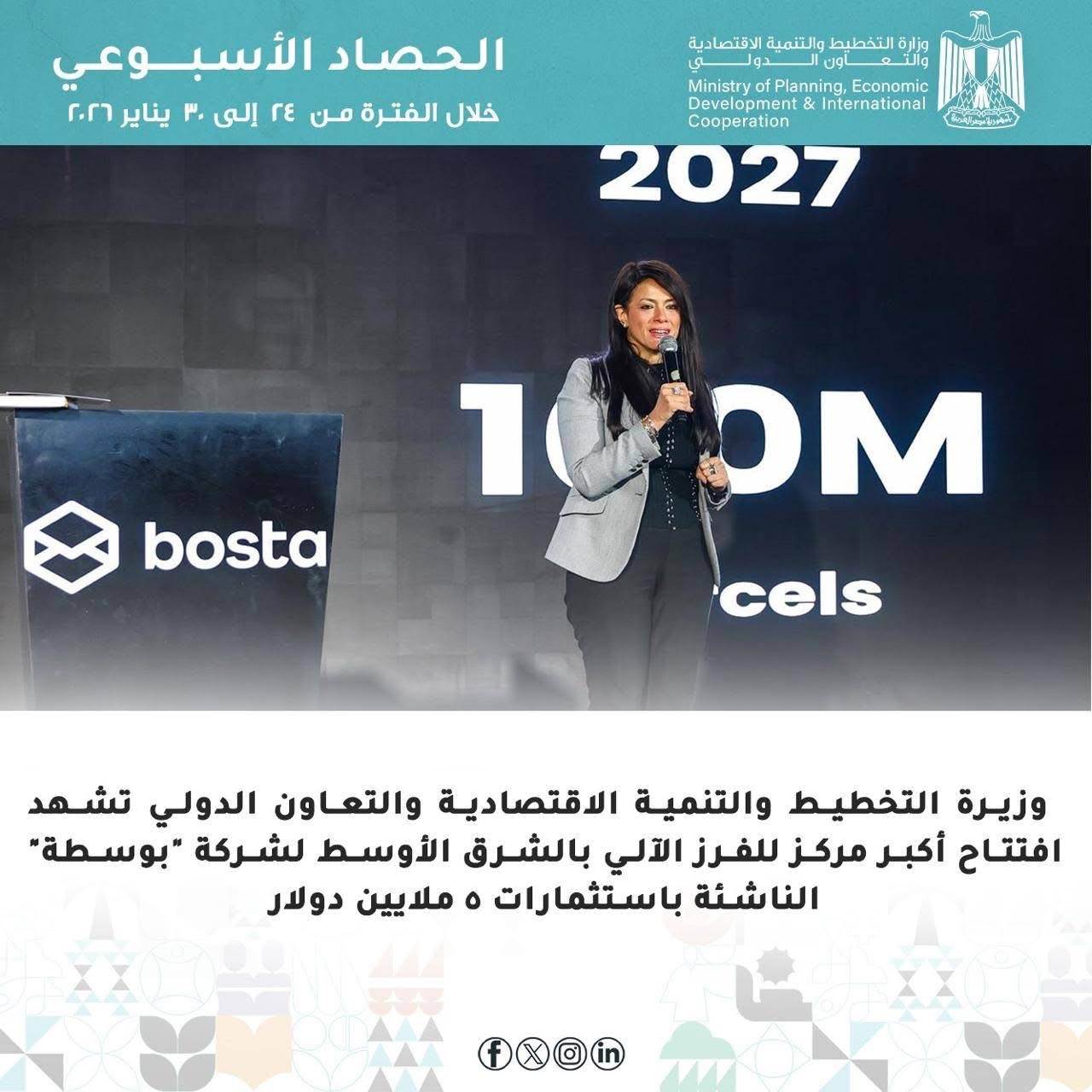 وشهدت الوزيرة افتتاح مركز الفرز الآلي لشركة "بوسطة"، الذي يُعد الأكبر من نوعه بمنطقة الشرق الأوسط، حيث يضم أكبر ماكينة فرز آلي، باستثمارات ٥ ملايين دولار، تقوم بفرز 11 ألف شحنة في الساعة و250 ألف شحنة يوميًا، وتستهدف الشركة توصيل نحو 80 مليون شحنة خلال عام 2026.