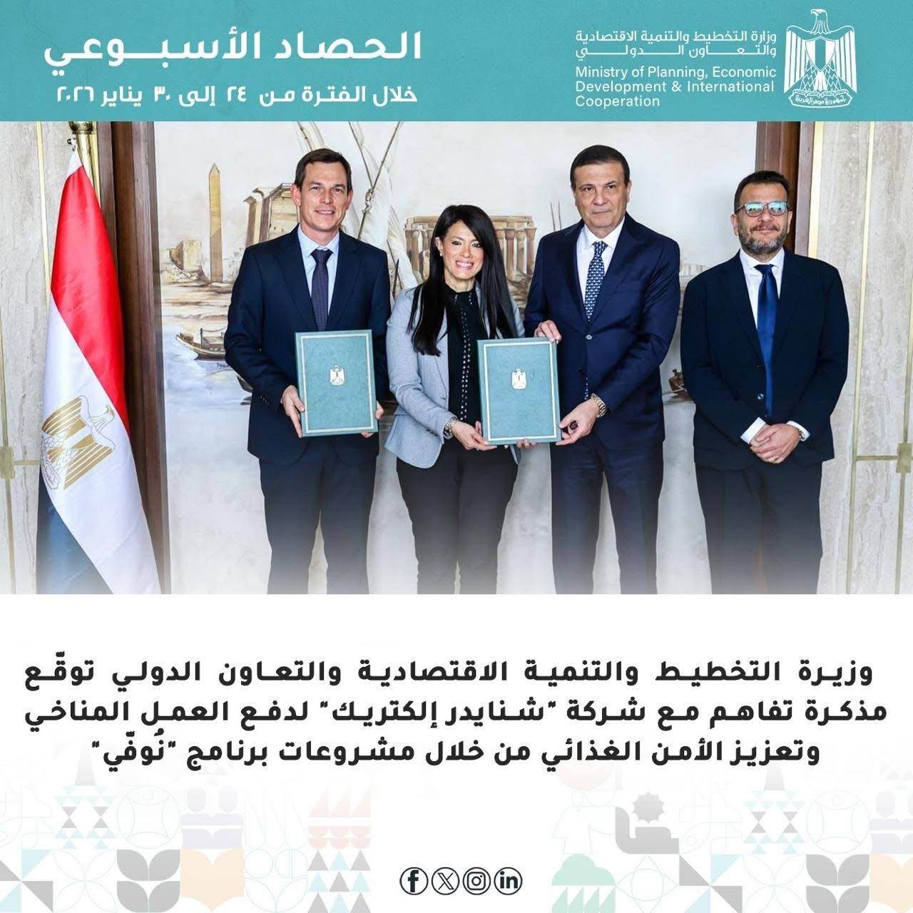 وفي سياق آخر وقّعت وزارة التخطيط والتنمية الاقتصادية والتعاون الدولي، مذكرة تفاهم مع شركة شنايدر إلكتريك مصر، في إطار تعزيز الشراكات مع القطاع الخاص لدعم جهود العمل المناخي، وتسريع التحول نحو الاقتصاد الأخضر، بما يتسق مع محاور المنصة الوطنية للمشروعات الخضراء برنامج «نُوفّي»، محور الارتباط بين مشروعات المياه والغذاء والطاقة.