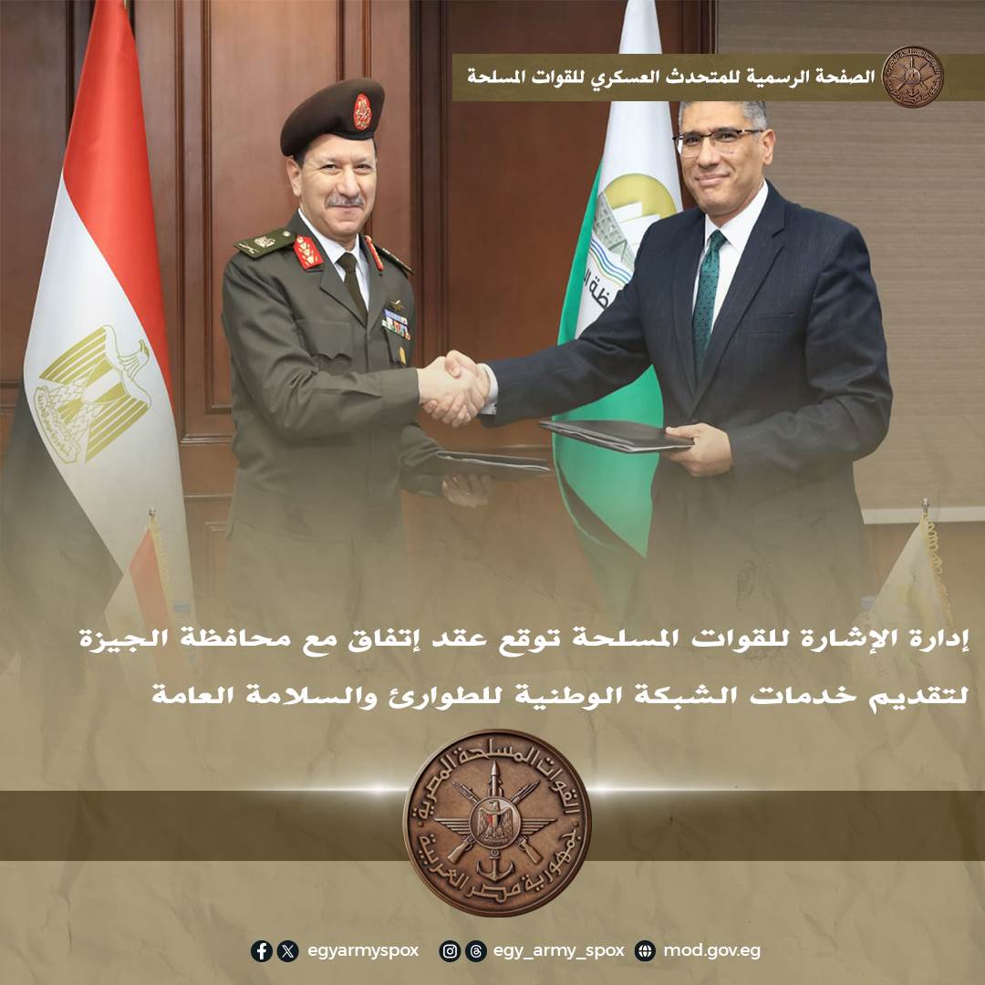 إدارة الإشارة للقوات المسلحة توقع عقد إتفاق مع محافظة الجيزة لتقديم خدمات الشبكة الوطنية للطوارئ والسلامة العامة