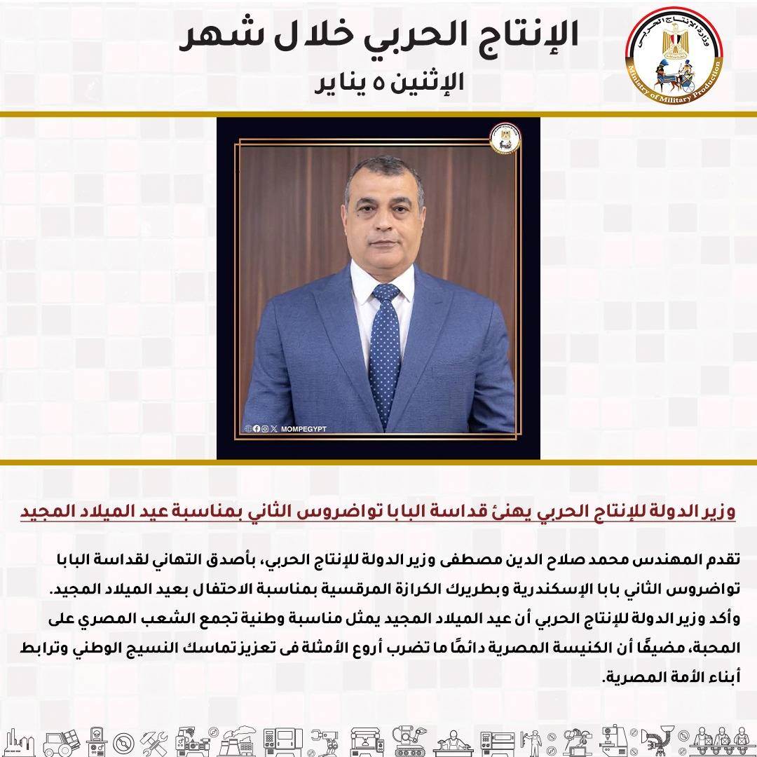 - -وزير الدولة للإنتاج الحربي يهنئ قداسة البابا تواضروس الثاني بمناسبة عيد الميلاد المجيد.