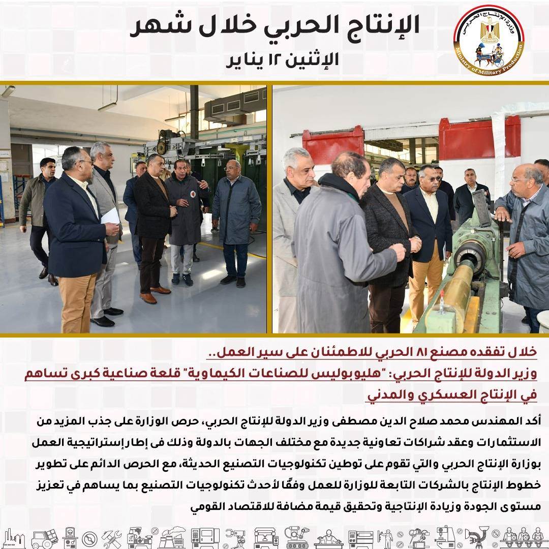 - -خلال تفقده مصنع 81 الحربي للاطمئنان على سير العمل.. وزير الدولة للإنتاج الحربي: "هليوبوليس للصناعات الكيماوية" قلعة صناعية كبرى تساهم في الإنتاج العسكري والمدني .