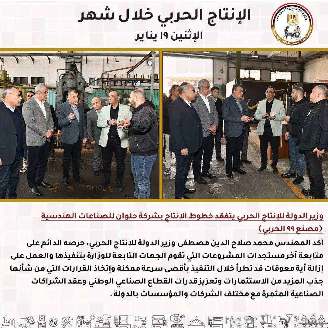 - -وزير الدولة للإنتاج الحربي يتفقد خطوط الإنتاج بشركة حلوان للصناعات الهندسية (مصنع 99 الحربي).