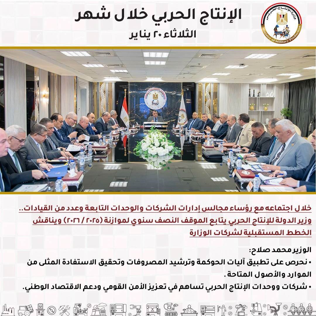 - وزير الدولة للإنتاج الحربي يتابع الموقف النصف سنوي لموازنة (2025 / 2026) ويناقش الخطط المستقبلية لشركات الوزارة.