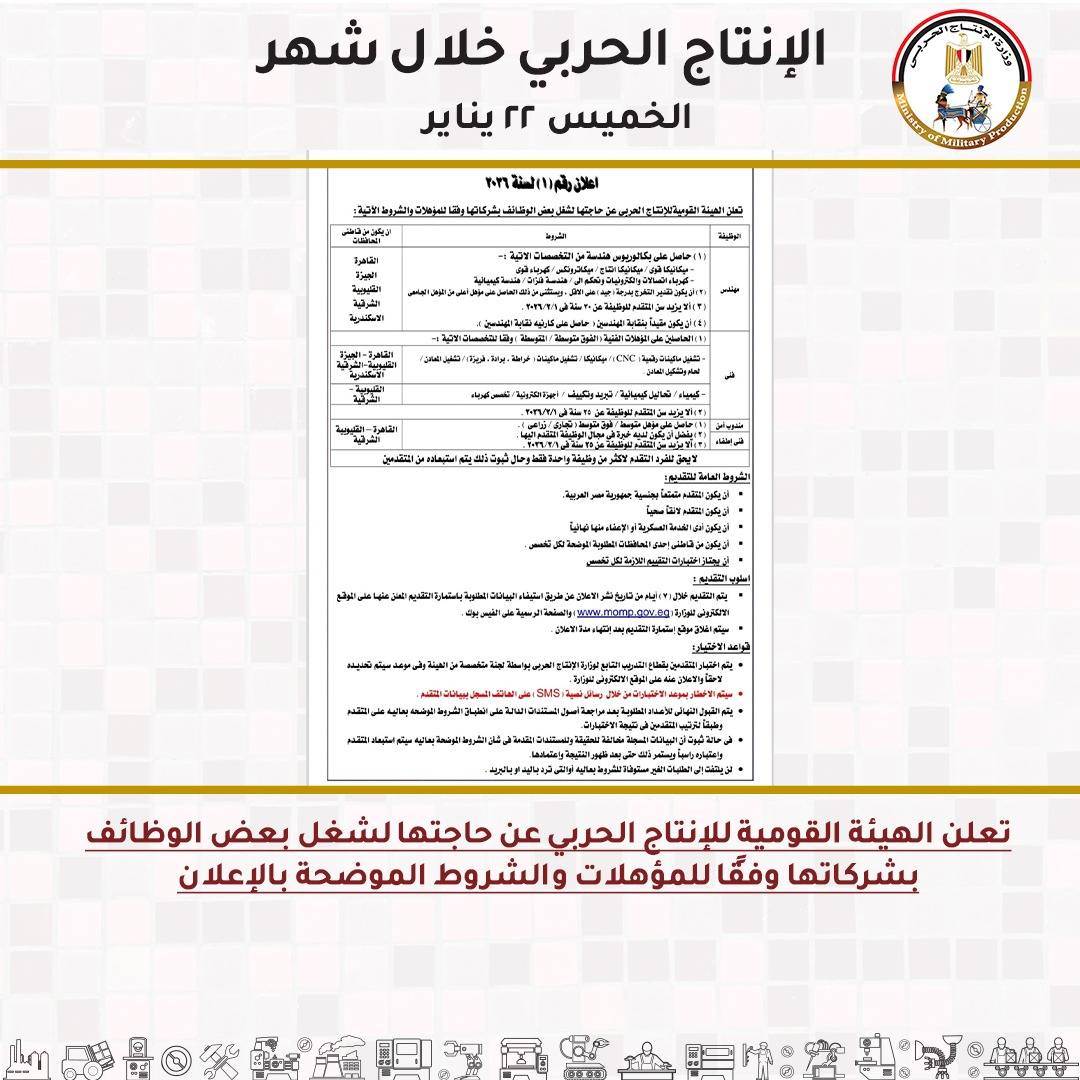 - -تعلن الهيئة القومية للإنتاج الحربي عن حاجتها لشغل بعض الوظائف بشركاتها وفقًا للمؤهلات والشروط .