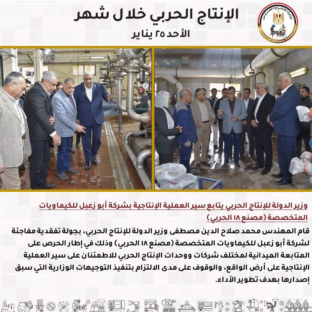 - -وزير الدولة للإنتاج الحربي يتابع سير العملية الإنتاجية بشركة أبو زعبل للكيماويات المتخصصة (مصنع 18 الحربي).