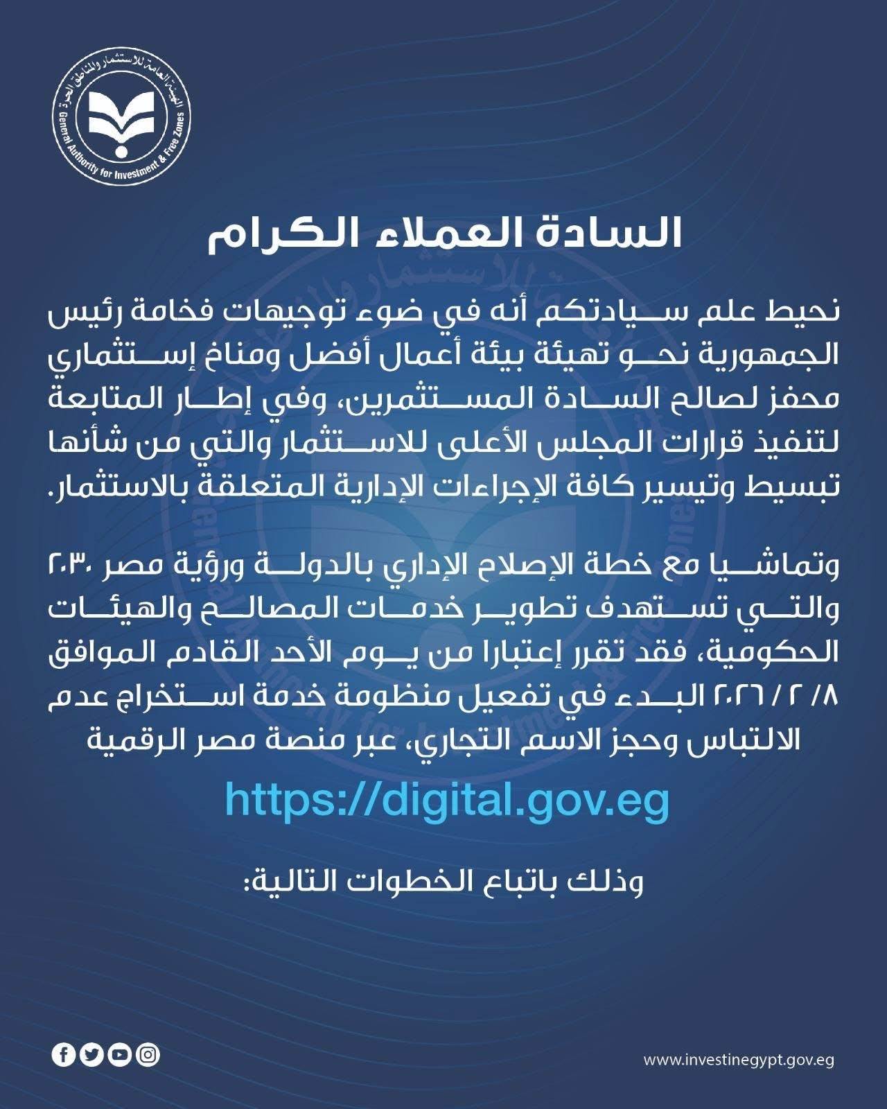 في إطار استكمال جهود الدولة المصرية نحو التحول الرقمي وتيسير الإجراءات على المستثمرين، ووفقًا لتوجيهات رئيس الجمهورية وقرارات المجلس الأعلى للاستثمار، أعلنت الهيئة العامة للاستثمار والمناطق الحرة، بالتعاون مع جهاز تنمية التجارة الداخلية، عن تفعيل منظومة استخراج شهادة عدم الالتباس وحجز الاسم التجاري إلكترونيًا عبر بوابة مصر الرقمية (https://digital.gov.eg)، اعتبارًا من 8 فبراير 2026، وذلك ضمن مستهدفات رؤية مصر 2030 للإصلاح الإداري وتطوير منظومة الخدمات الحكومية.