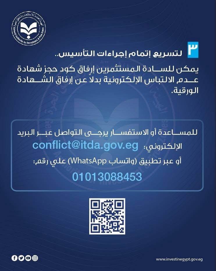 وفي هذا الإطار، تتيح الهيئة العامة للاستثمار والمناطق الحرة للمستثمرين إمكانية إرفاق كود حجز شهادة عدم الالتباس الإلكترونية على نظام التأسيس المميكن، كبديل عن إرفاق الشهادة الورقية، بما يسهم في استكمال إجراءات التأسيس بسهولة ويسر، ويدعم جهود التحول الرقمي.