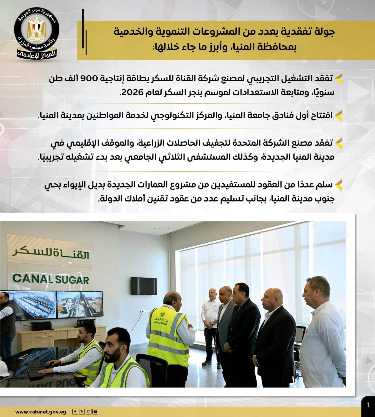 وتضمنت الأنشطة، جولة تفقدية أجراها رئيس الوزراء، بعدد من المشروعات التنموية والخدمية بمحافظة المنيا، حيث تفقد التشغيل التجريبي لمصنع شركة القناة للسكر بطاقة إنتاجية 900 ألف طن سنويًا، ومتابعة الاستعدادات لموسم بنجر السكر لعام 2026، كما افتتح أول فنادق جامعة المنيا، والمركز التكنولوجي لخدمة المواطنين بمدينة المنيا.