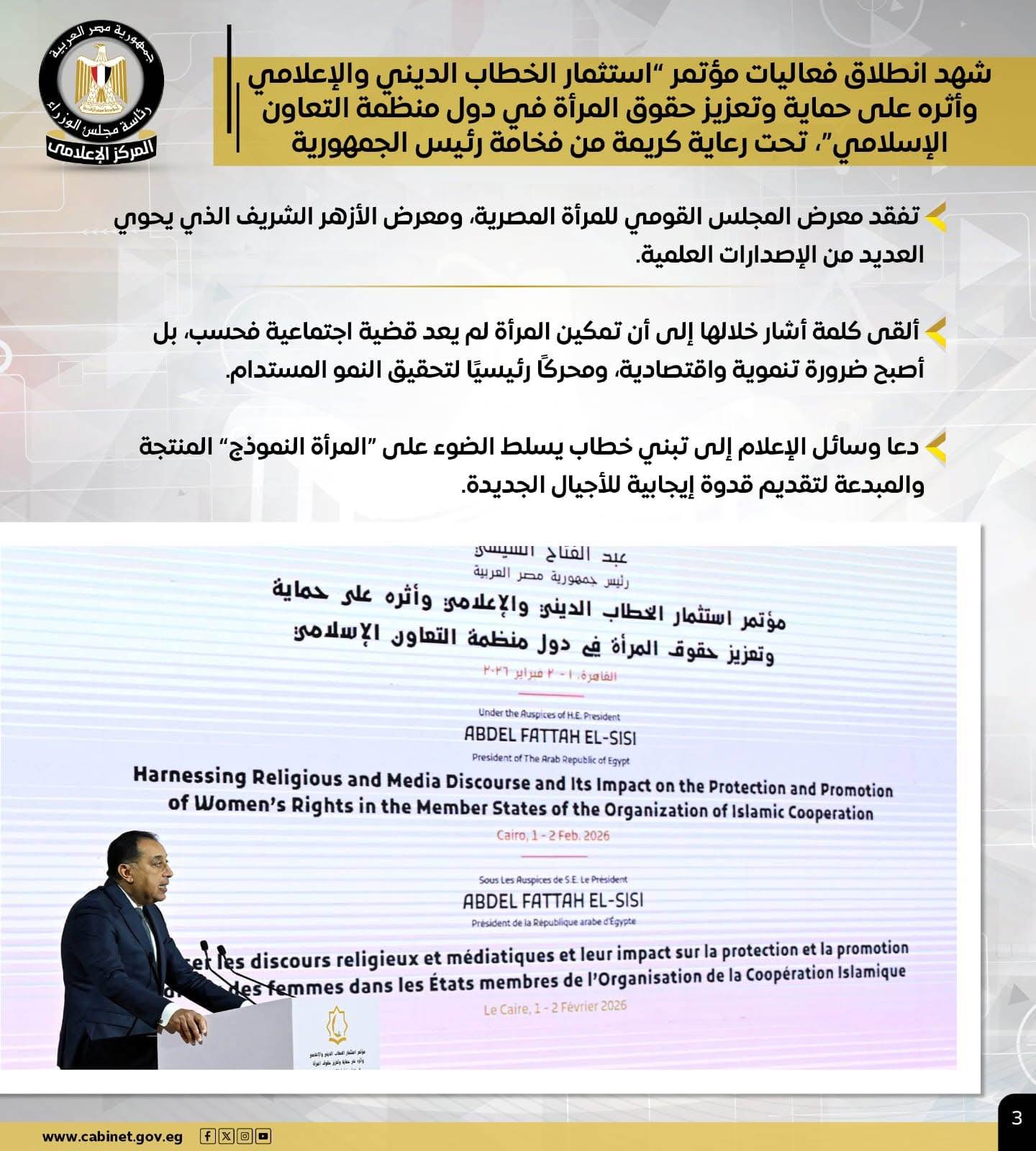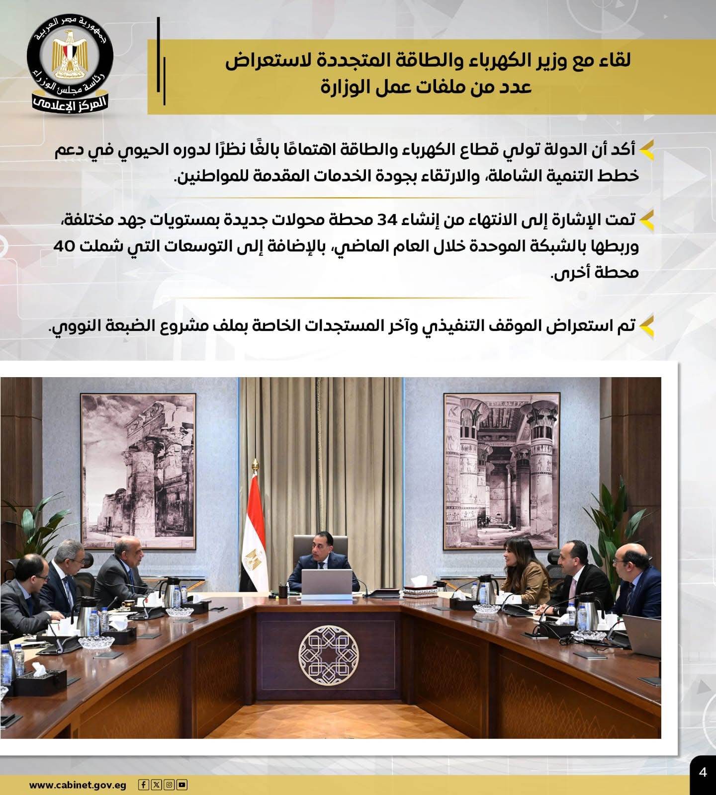 نشر المركز الإعلامي لمجلس الوزراء، عددًا من الإنفوجرافات عبر منصاته على مواقع التواصل الاجتماعي، استعرض خلالها أبرز أنشطة الدكتور مصطفى مدبولي، رئيس مجلس الوزراء، خلال الأسبوع الجاري من 31 يناير حتى 6 فبراير 2026، لقاءات واجتماعات ومتابعات للمشروعات الحيوية.