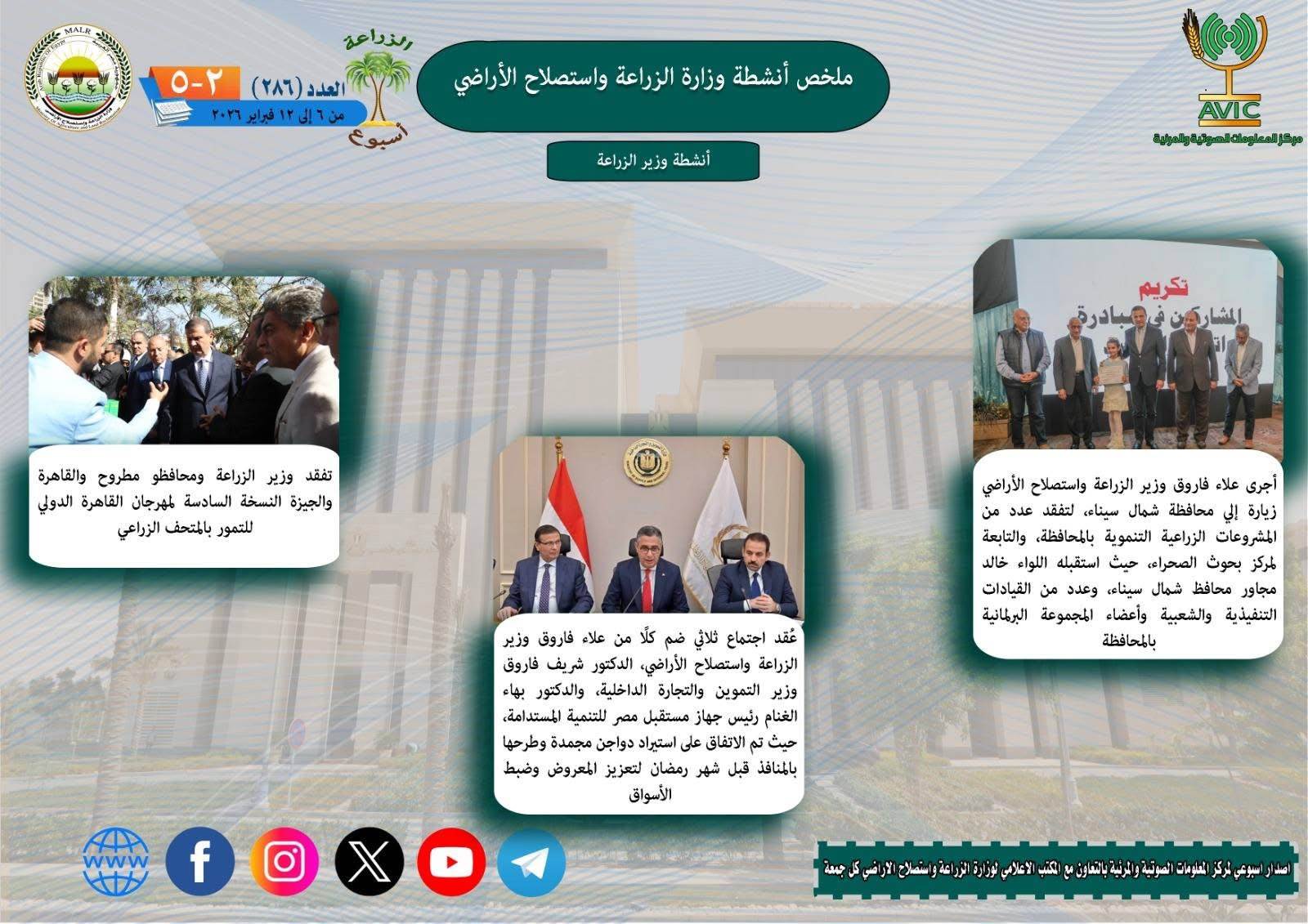 يذكر ان مركز المعلومات الصوتية والمرئية، والمكتب الاعلامي للوزارة، يصدران الجمعة من كل اسبوع، انفوجرافا وفيديو باسم: الزراعة في اسبوع، لالقاء الضوء على ملخص ما تم من انشطة وجهود، بكافة القطاعات والهيئات، التابعة للوزارة.